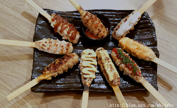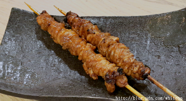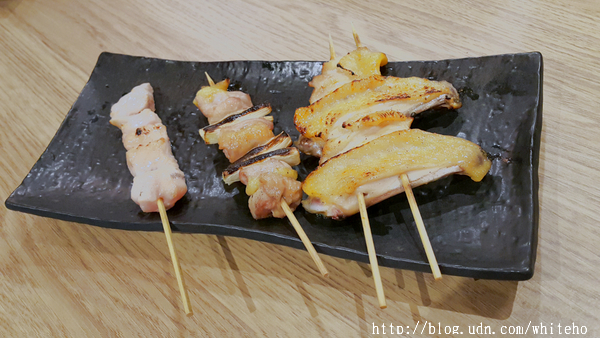 燒鳥系列NT$100/串 鹽烤與醬烤兩種調味的串烤,有雞胸串、雞翅部位的手羽先串及使用三星蔥段碳烤的三星蔥雞腿肉串