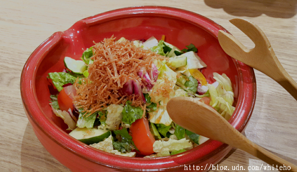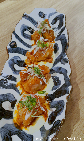 喜歡這道鳥丈招牌沙拉NT$280 口感酸甜的沙拉醬拌入日本常見的紫蘇葉、多種生菜等,同時搭配廣島魚漿絲,鮮甜香酥的魚漿絲與沙拉簡直是絕妙組合。