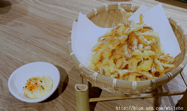 更愛這道函館魷魚絲天婦羅NT$150 函館盛產的魷魚絲調味後以日本進口混入蛋黃調製的炸粉酥炸,酥脆有嚼勁的魷魚絲天婦羅搭配日本鹹味美乃滋與七味粉調配的特製醬汁一同食用,越吃越香很難停下筷子。