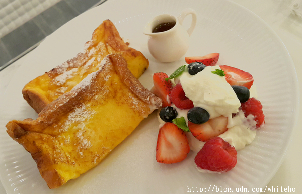 【季節水果法式吐司】布里歐吐司浸入添加牛乳的蛋液中吸飽蛋汁而更蓬鬆、軟嫩,煎到嫩黃上色後再撒上糖粉與水果、楓糖,香甜的醇郁滋味!