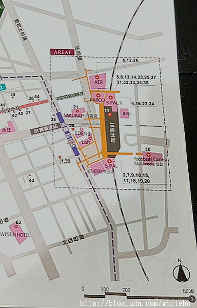 再放大.... 不管從照片或地圖,都不難看出,出了仙台車站西口門,可透過數個不同方向的天橋,通往車站對面成排的品牌專門店,包括:PARCO2、AEON、loft、ABC、無印良品、H&M、Sakura野百貨、YAMADA電機、TSURUHA藥妝店、AER(pokemon go專賣店)等,除了百貨、流行服飾,也有許多仙台名物、生活雜貨、藥妝店、家電用品店等。