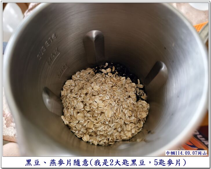 2大尖匙的黑豆~ 5大匙的大燕麥片~~ 加水到1000CC 其實,多人飲用的話, 打米漿加水超過它的最高線也沒關係喔~~😅