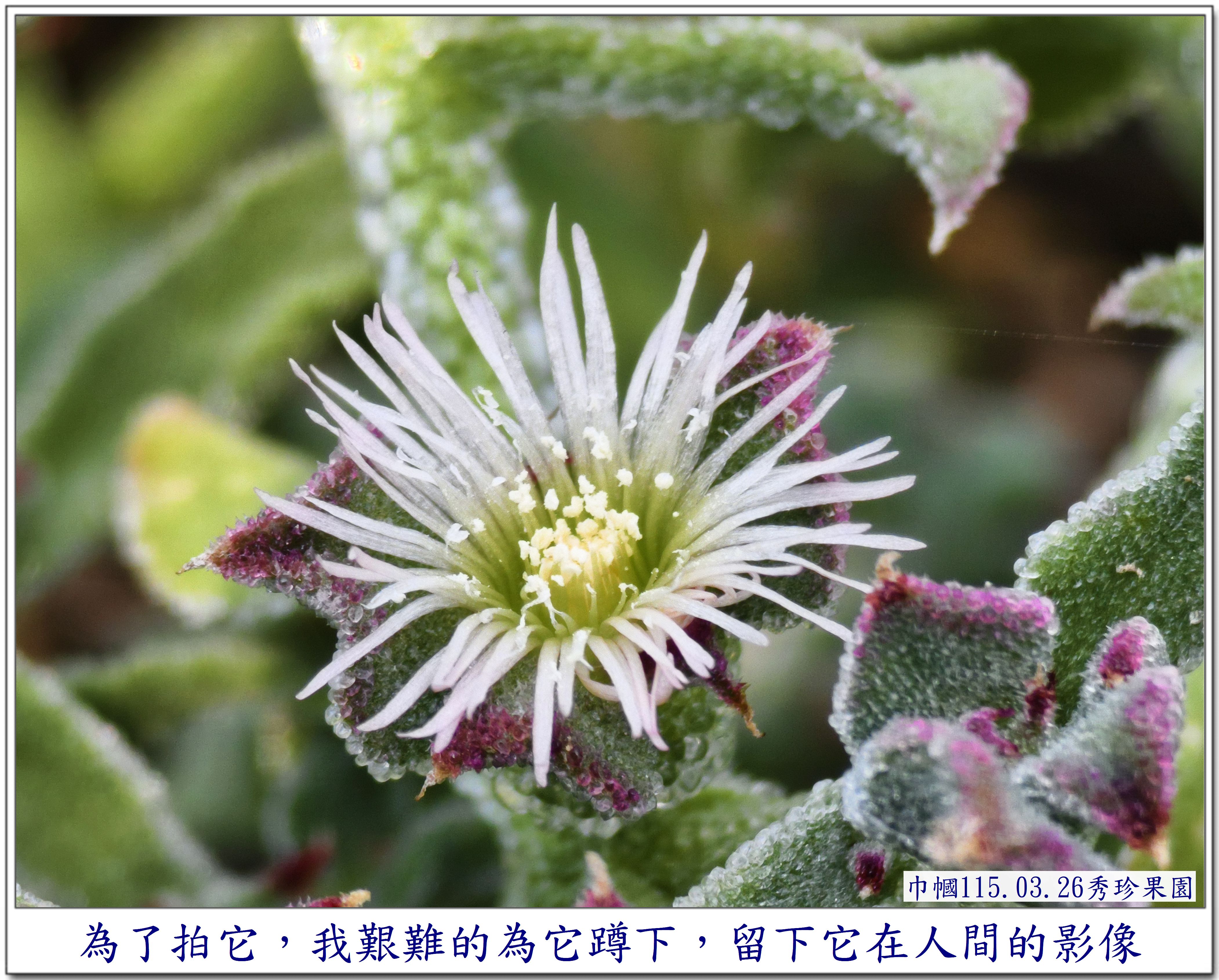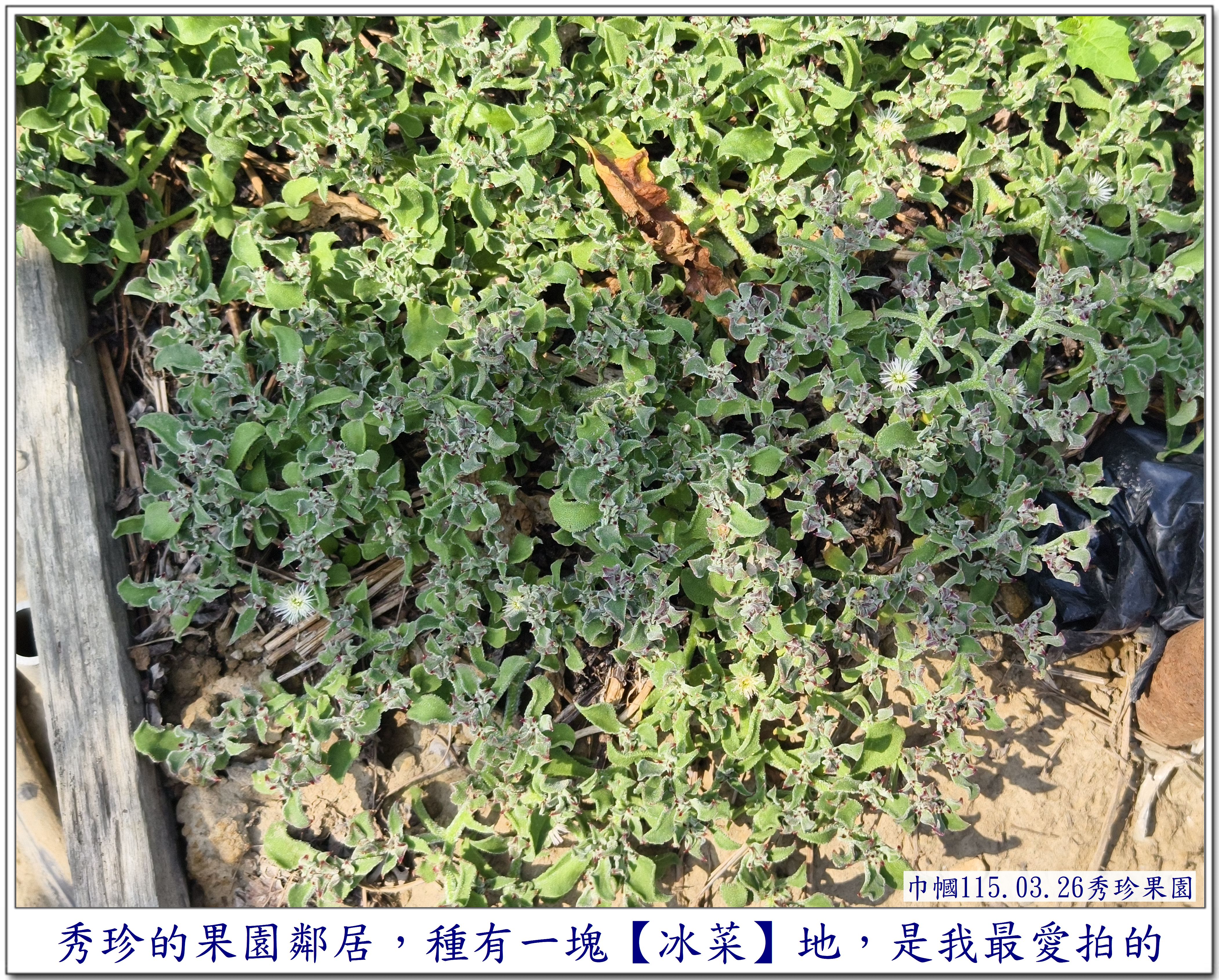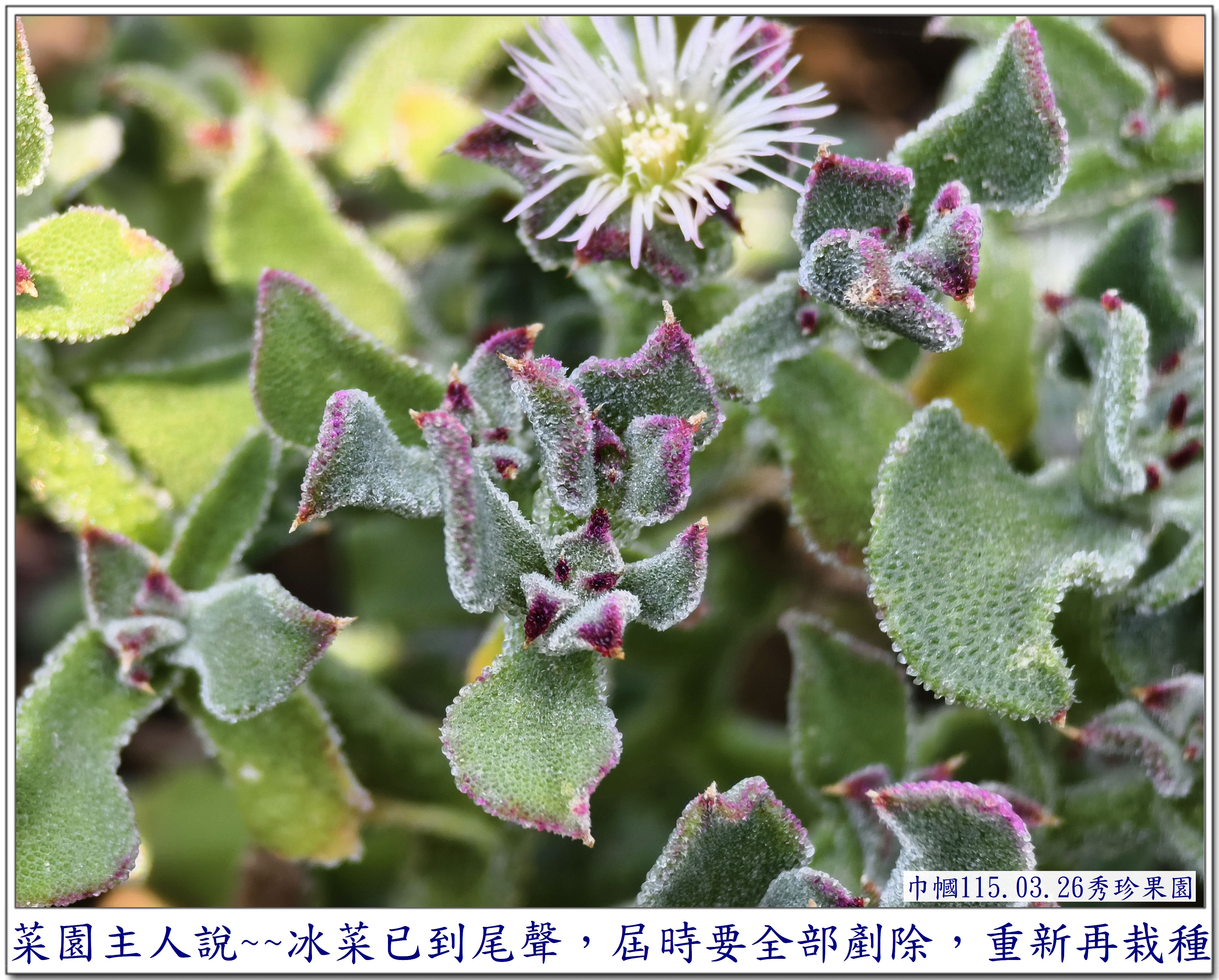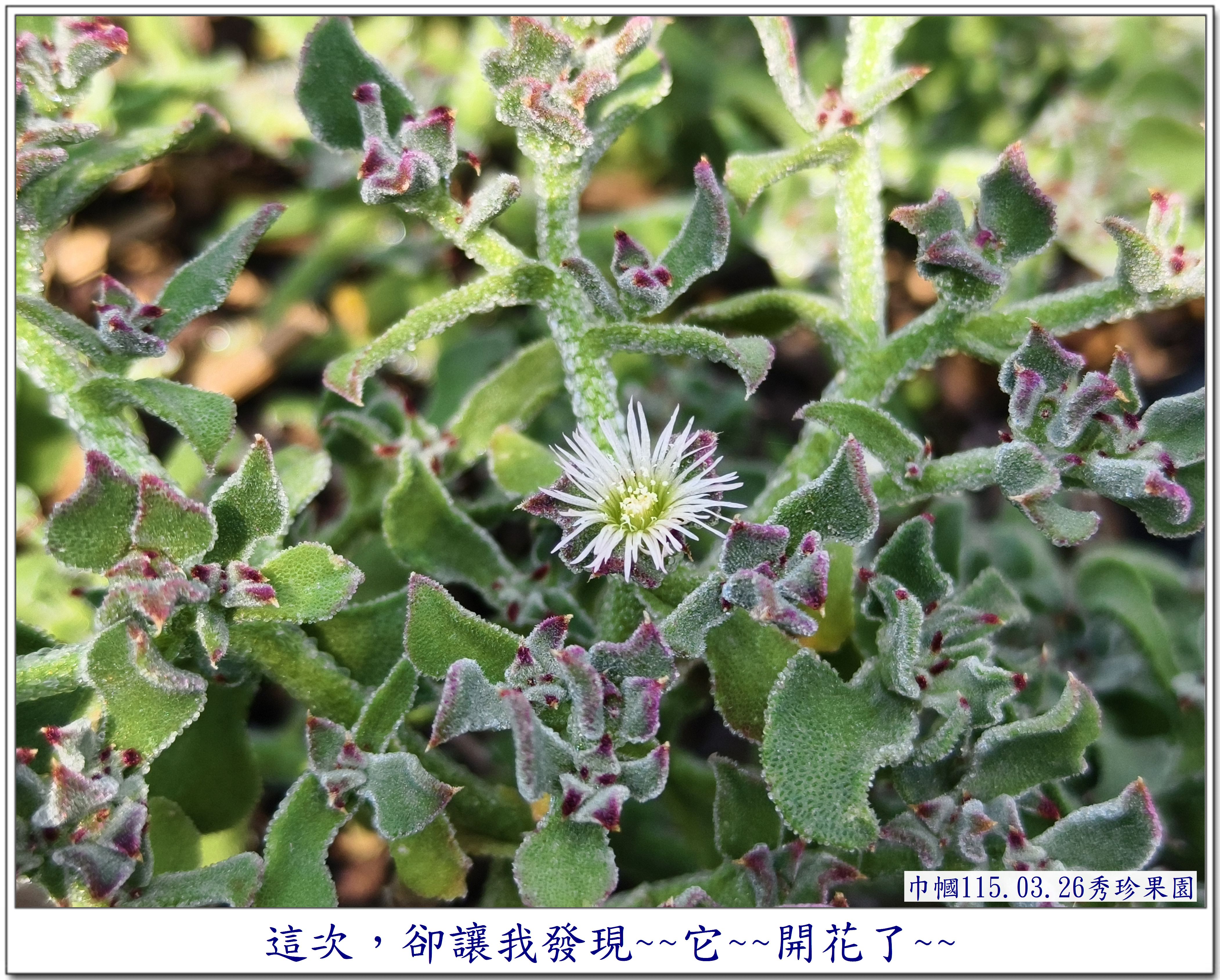 第一次看到葉子上長滿了水珠的它, 讓我感到好奇~~ 是在秀珍果園旁的鄰居~~ 一園子種了許多的蔬菜,還有一些水果, 也是讓我每次去秀珍那,最期盼去拍照的地方😆 這次,秀珍邀我去採【皇帝豆】, 剛好菜園主人也在~~ 就隨著秀珍一起去拜訪一下😄 秀珍是直奔主人棚跟他聊天, 我則是【蛇眼四方掃色】找尋拍照的目標😆 當然,我記得它~~ 珍貴的【冰菜】 嘿嘿~~還在~~😆 直接奔向它~~拍照😄 突然~~ 看見~~ 它~~開花了😱 是否會結籽,可以再繁衍😆 因為花兒不大, 不得不 為了拍它, 艱難的為它蹲下,拍得比較清楚😆 還不錯, 前幾天去了一趟四川旅遊~~ 上了幾次【用蹲著】的廁所, 稍微訓練了一下我腰腿的力量, 所以, 才有這個蹲下去拍照再站起來的勇氣~~ 雖然很艱難,我還是做到了~~ 只是腰腿有些微顫顫的抖動😆 還需要繼續努力做復健才是🙏 不過, 相對一年前的身體,是進步了許多😁 冰菜 AI給我的資料是 ~~~~~ 獨特外觀: 葉片和莖上覆蓋著透明的泡狀細胞, 外觀如同冰晶或露珠, 這其實是植物用來儲存礦物質和水分的結構。 食用特性: 是一種生食級蔬菜, 口感鮮脆爽口, 帶有淡淡的天然鹹味。 生長環境: 原產於南非, 屬於耐鹽的多肉植物, 常生長於砂質土壤中。 產季: 台灣的冰菜產季通常在每年12 月至隔年4 月。