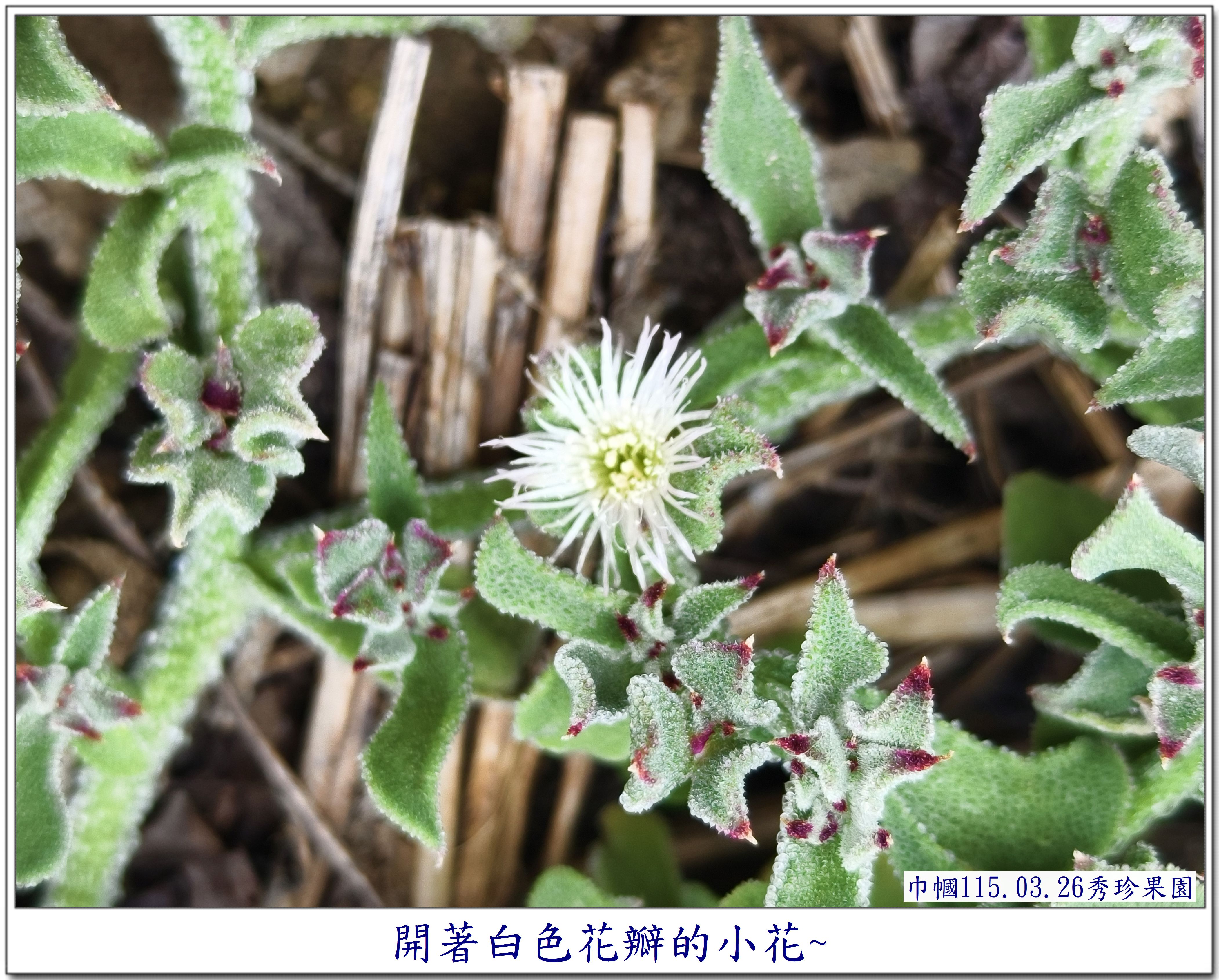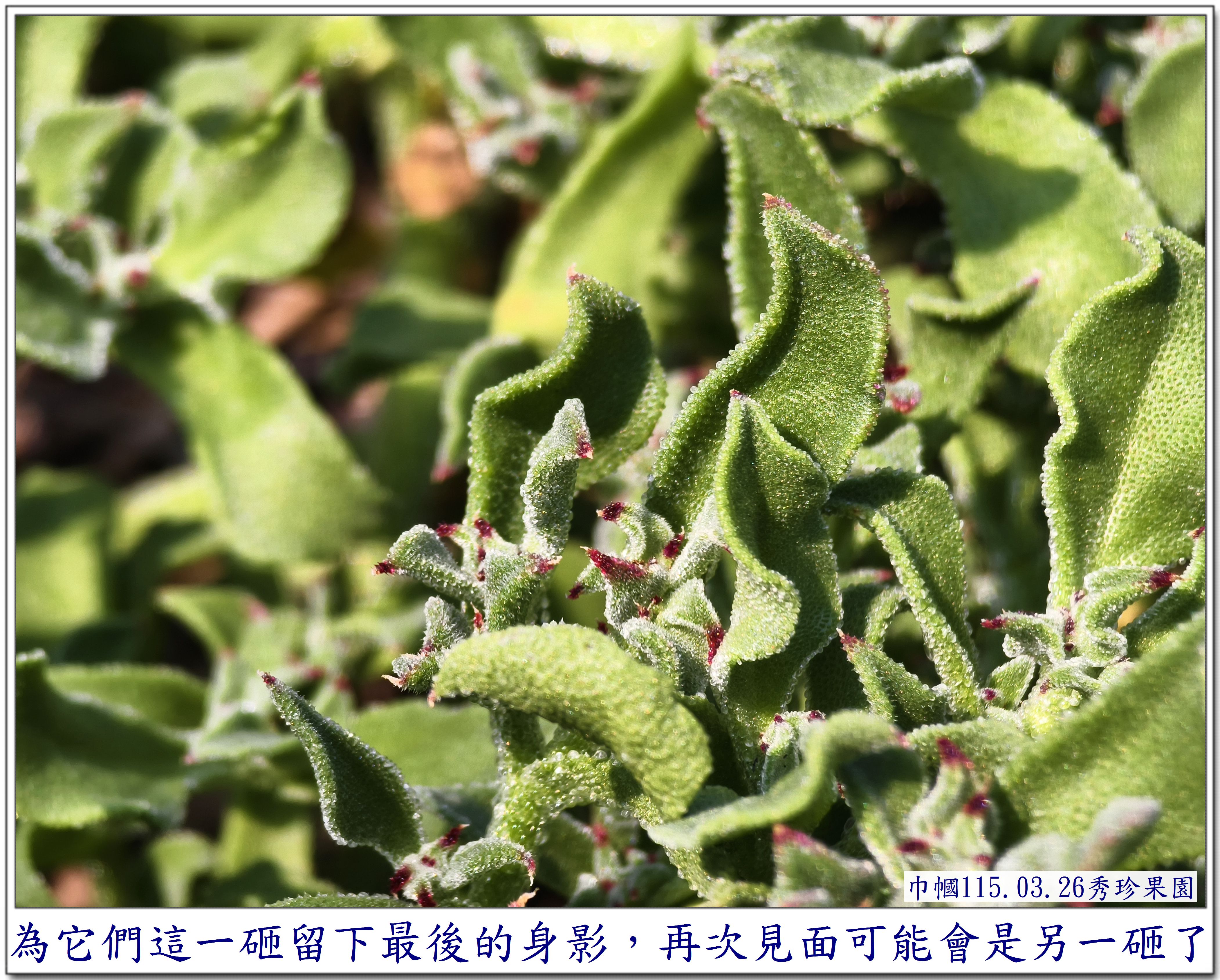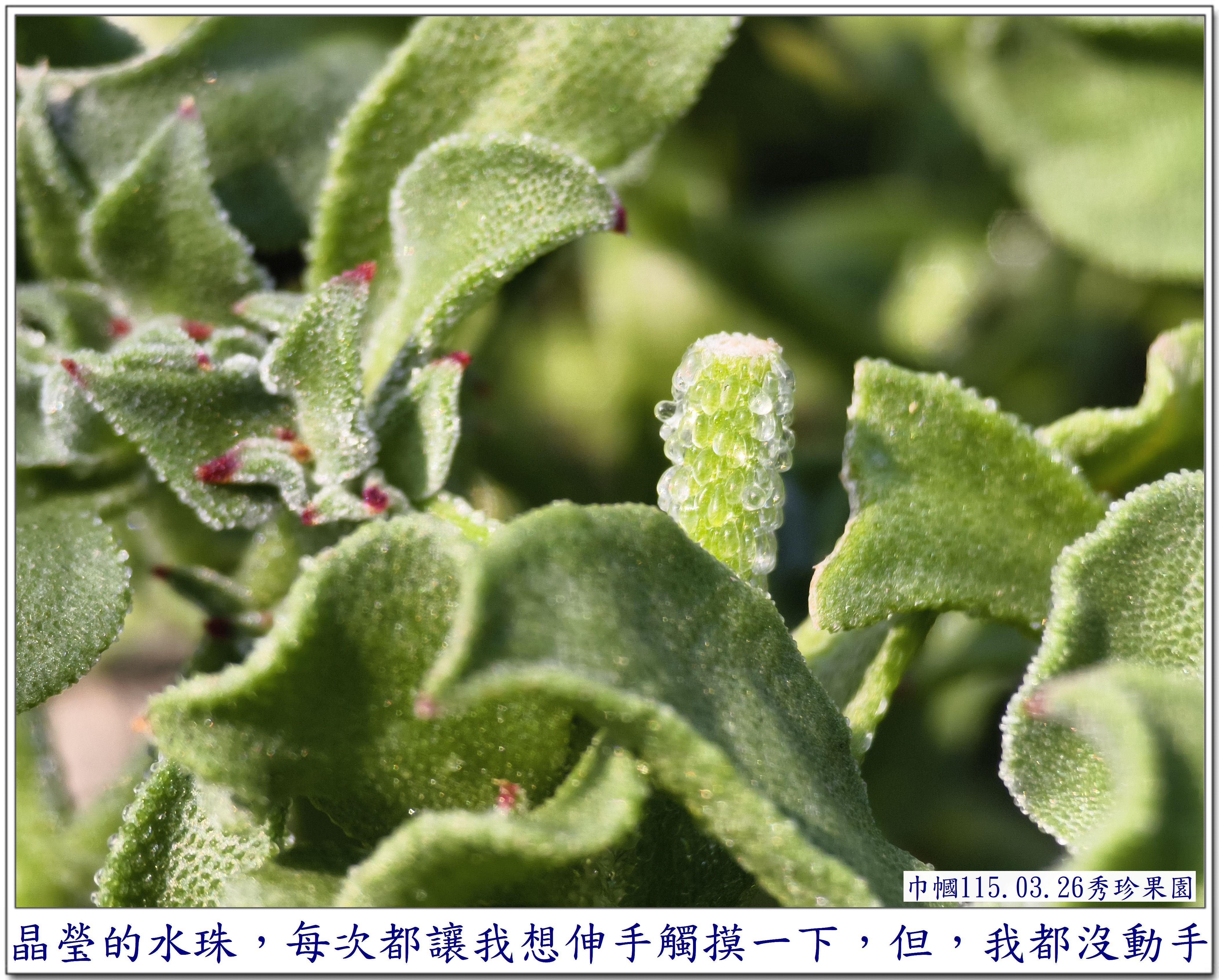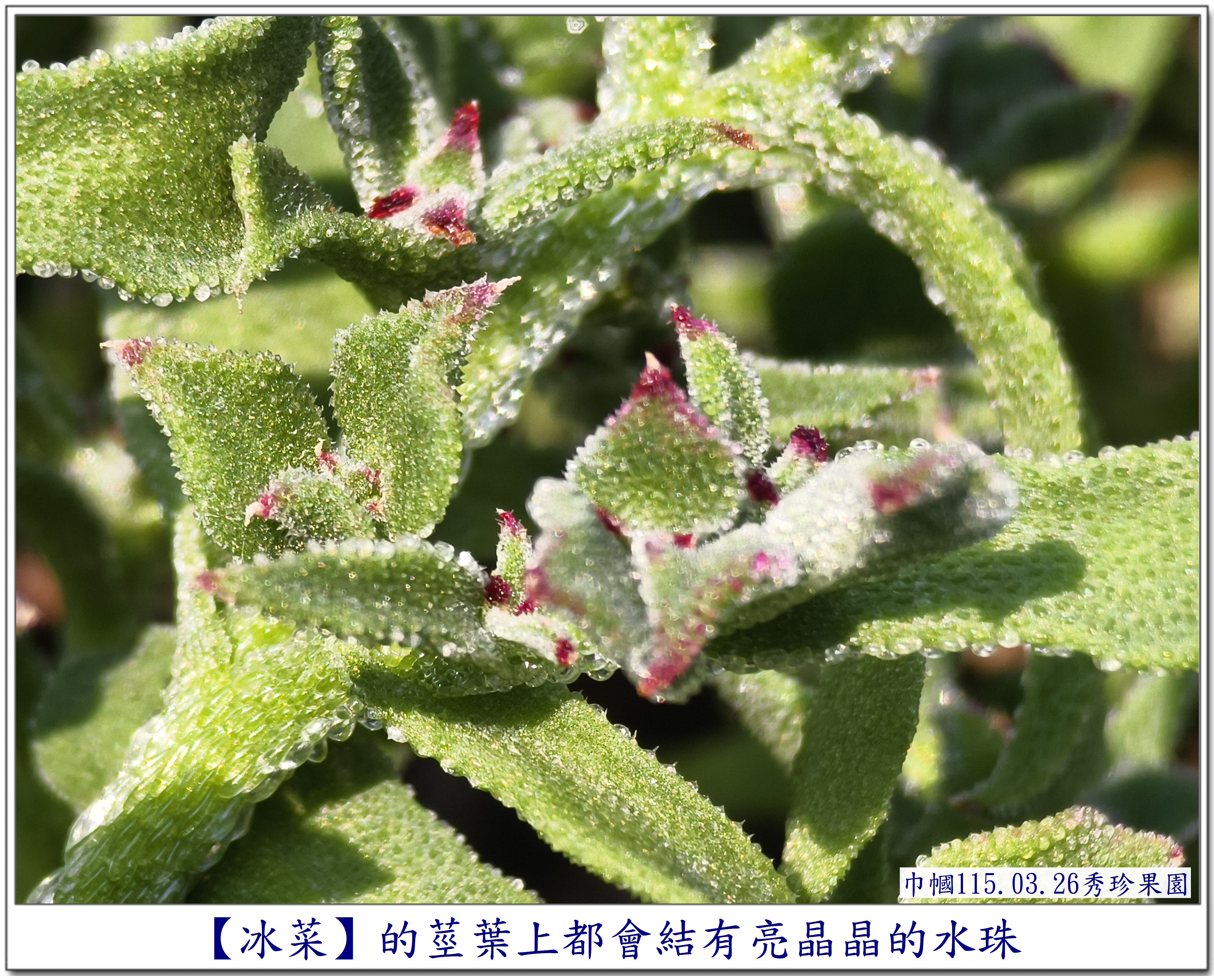 第一次看到葉子上長滿了水珠的它, 讓我感到好奇~~ 是在秀珍果園旁的鄰居~~ 一園子種了許多的蔬菜,還有一些水果, 也是讓我每次去秀珍那,最期盼去拍照的地方😆 這次,秀珍邀我去採【皇帝豆】, 剛好菜園主人也在~~ 就隨著秀珍一起去拜訪一下😄 秀珍是直奔主人棚跟他聊天, 我則是【蛇眼四方掃色】找尋拍照的目標😆 當然,我記得它~~ 珍貴的【冰菜】 嘿嘿~~還在~~😆 直接奔向它~~拍照😄 突然~~ 看見~~ 它~~開花了😱 是否會結籽,可以再繁衍😆 因為花兒不大, 不得不 為了拍它, 艱難的為它蹲下,拍得比較清楚😆 還不錯, 前幾天去了一趟四川旅遊~~ 上了幾次【用蹲著】的廁所, 稍微訓練了一下我腰腿的力量, 所以, 才有這個蹲下去拍照再站起來的勇氣~~ 雖然很艱難,我還是做到了~~ 只是腰腿有些微顫顫的抖動😆 還需要繼續努力做復健才是🙏 不過, 相對一年前的身體,是進步了許多😁 冰菜 AI給我的資料是 ~~~~~ 獨特外觀: 葉片和莖上覆蓋著透明的泡狀細胞, 外觀如同冰晶或露珠, 這其實是植物用來儲存礦物質和水分的結構。 食用特性: 是一種生食級蔬菜, 口感鮮脆爽口, 帶有淡淡的天然鹹味。 生長環境: 原產於南非, 屬於耐鹽的多肉植物, 常生長於砂質土壤中。 產季: 台灣的冰菜產季通常在每年12 月至隔年4 月。
