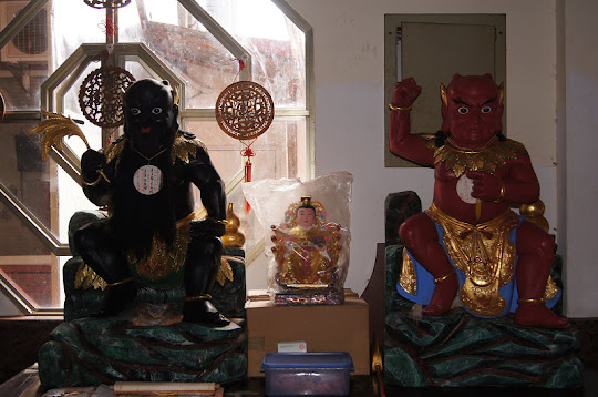 天穿日過後造訪花蓮‧豐濱~女媧娘娘廟(姻緣の媒神) 日期:2012.2.13(星期一)/農曆正月廿二日 地點:花蓮縣豐濱鄉豐濱村小港1-3號 伏羲女媧是我國古代傳說中的人類祖先,人首蛇身,相傳曾煉五色石以補天,並摶土造人(女媧在造人之前,於正月初一造雞,初二造出狗,初三造豬,初四造羊,初五造牛,初六造馬,到了初七這一天造出人類,因此正月初七又稱「人日」),制嫁娶之禮,延續人類生命,造化世上生靈萬物。(※另有補充的說法,初八是穀日,初九是天日,初十是地日。) 在新疆阿斯塔那古墓出土文物唐代的絹畫--伏羲女媧圖,人首蛇身的男女二人,上身相擁下身相交。伏羲頭戴冠幘,左手持矩舉至頭頂,右手提墨斗搭在女媧肩上。女媧頭綰高髻,兩腮塗紅,面頰豐滿,右手持規舉至頭頂,左手握四支短棍搭在伏羲肩部。二人均穿寬袖白花對襟紅袍,腰間共繫一條喇叭狀短裙,下身以環狀紋的蛇身纏繞作三圈。伏羲深目高鼻,女媧細眉,鼻梁高直,是西域少數民族的形象。