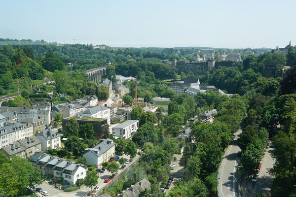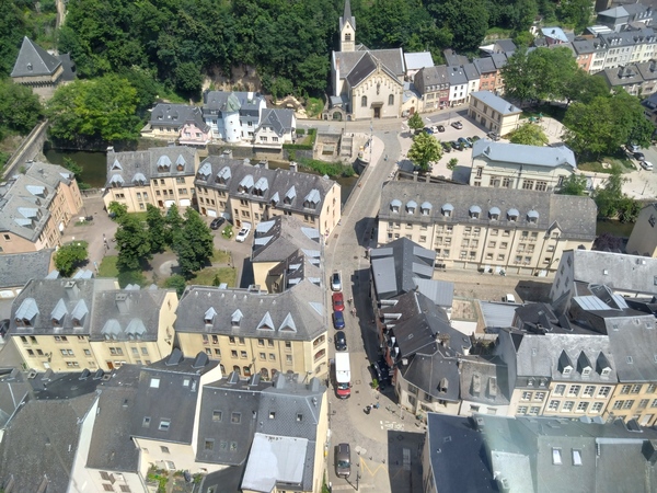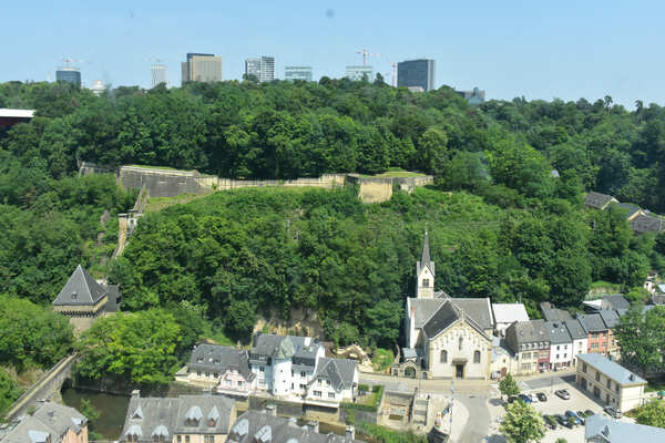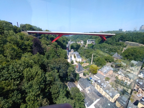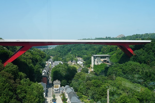經過一座水勢豐沛的噴泉,上城區北郊的Parc Fondation Pescatore裡面,Ascenseur Panoramique du Pfaffenthal是一座71公尺高、垂直銜接Pfaffenthal(普法芬塔爾)的全景電梯。相對於佩特羅斯河谷的綠意盎然,流貫阿爾澤特河的峽谷只見儼然屋舍;Pfaffenthal(普法芬塔爾)地名源自德文Pfaffen(僧侶)和Tal(山谷)的組合,因為當地往昔存在著修道院而得名,至於盧森堡市民則暱稱「Dällchen」,意思是「小酒窩」。 除了修道院,Pfaffenthal以往更是各行各業工匠的聚居地;黑瓦白牆的屋舍之間,一條筆直的街道通向翠綠山腳、造型樸拙可愛的Romanian Orthodox Church(羅馬尼亞東正教堂)清晰可辨,教堂背後是一連串火車行駛的石拱橋,半山腰則是Fort Niedergrünewald堅實的防禦工事。望向河流上游,夏洛特大公橋(Pont Grande-Duchesse Charlotte)俗稱「紅橋」(Rout Bréck),從上城區銜接至峽谷彼岸、設置歐洲聯盟法院(Cour de justice de lUnion européenne)的基希貝格高原(Kirchberg Plateau)。