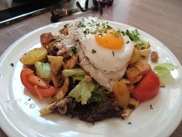 端上主菜之前,今日例湯(Potage du jour)略帶鹹味,表面撒上歐芹(parsley),濃湯本身可能是由牛肉、洋蔥、紅椒粉,以及馬鈴薯燉煮而成;Salade paysanne(農家沙拉)是盛裝萵苣、紫色生菜、番茄、馬鈴薯、蘑菇、雞肉、培根、麵包丁,以及一顆半熟蛋的沙拉拼盤;Roulades de bœuf, purée de pommes de terre et salade(牛肉捲,附馬鈴薯泥與沙拉)則是薄切牛肉片包裹洋蔥、培根,以及酸黃瓜,佐以紅酒和高湯,至於馬鈴薯泥口感極為細膩香醇。 最經典的盧森堡國菜,當屬Judd mat Gaardebounen(煙燻豬頸肉),為了方便溝通,服務生和我將之暱稱為「pig neck」(豬脖子);煙燻豬頸肉片為主菜,豬肉口感厚實,富含鹽漬與煙燻的韻味,配菜是洋蔥和肉汁慢燉的蠶豆,以及水煮馬鈴薯,搭配香草點綴的芥末醬。 整體而言,盧森堡的物價不菲,不過,咖啡館的菜餚料豐味美,三份餐點、兩份湯品,外加兩個便利分食的小盤子,對於我們一行五個人而言綽綽有餘;由於手機恢復網路連線,我更把握機會,在飯前將照片分享至Instagram限時動態。值得一提的是,在我們用餐的同時,相鄰座位的客人點了滿滿一桌的料理,他啜飲著盧森堡白葡萄酒,與服務生相談甚歡。