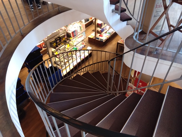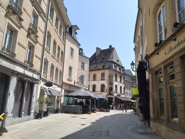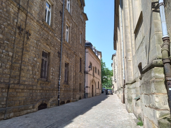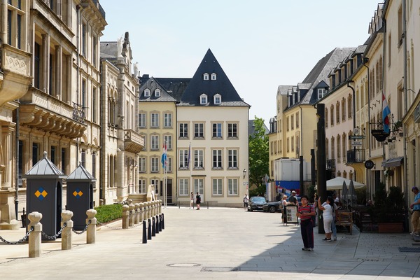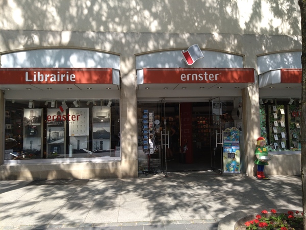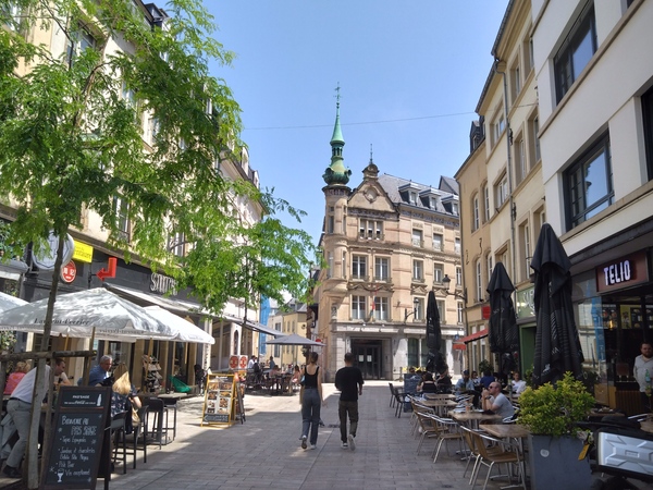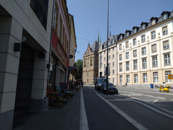 上城區幅員不大,距離Parc Fondation Pescatore最近的公車站Crispinus,位在夏洛特大公橋的北方;到達公車站之前,一片樹林下的綠草地,許多人或坐或躺,享受午後和煦的陽光,而美國大使館正位在綠草地附近。 7. 不同膚色的人們穿梭於羅斯福大道,沿線自行車專用道上騎士馳騁;行經上城區朝向佩特羅斯河谷傾斜的市街,3號公車悠悠晃晃地返回羅斯福站;順著聖母院背後的Rue de la Congrégation(修會街),走向Librairie Ernster和大公宮殿(Palais Grand-Ducal)。 街道路幅狹窄,起初是一段樓房側面的石牆,柳暗花明又一村,隨後竟然意外遇見建築於18世紀,外觀呈現新古典主義風格的盧森堡國務部(Ministry of State)。國務部附近的Librairie Ernster是一間館藏豐富的書店,書店中央的螺旋梯串連上下樓層;除了地圖集之外,法文和德文書籍應有盡有。Librairie Ernster和國務部之間的廣場,豎立夏洛特大公(Grande-Duchesse Charlotte)的塑像。