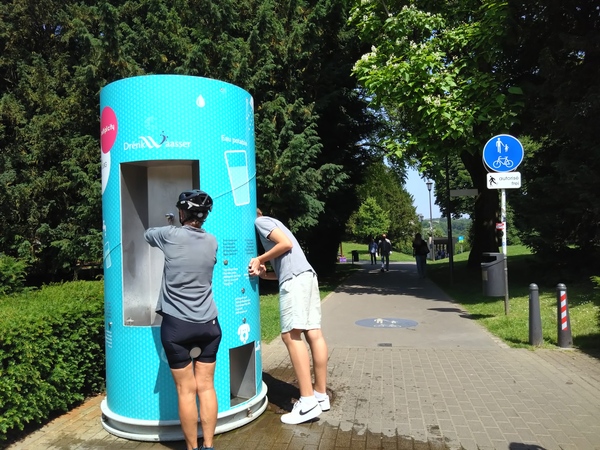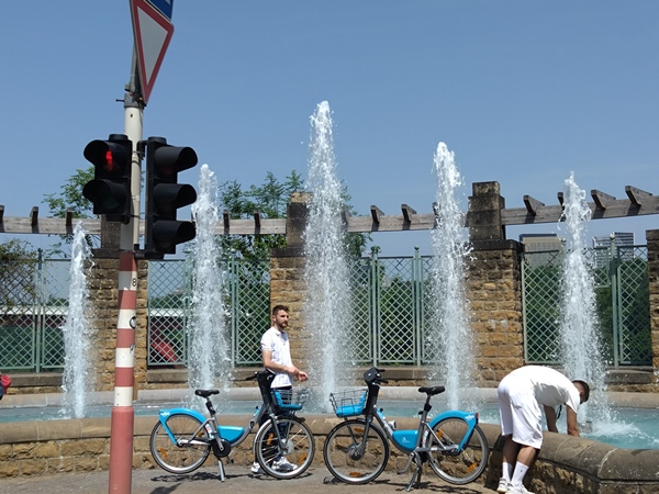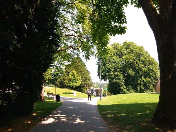 綠樹成蔭,Parc Fondation Pescatore的中央是Pescatore, J.P. Foundation安養中心,周圍環繞如茵草地;就在安養中心和全景電梯的交叉路口,一部淺藍色圓柱體的飲水機,免費供應冰涼的飲用水。聚集在飲水機四周,其中一名遊客熱心地為我將冰水注滿水壺,在這炎熱的天氣裡,每個取水的遊人彷彿久旱逢甘霖,對於我們而言,從餐廳走到這裡的一身疲憊,更一掃而空。
