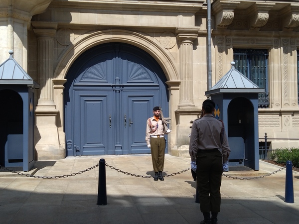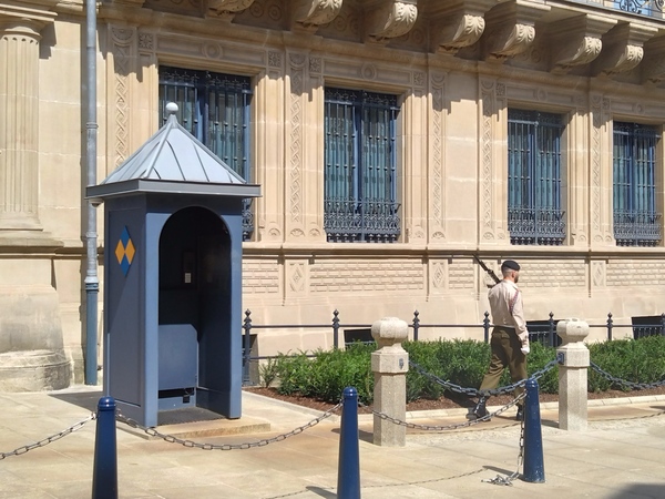 位於Librairie Ernster背後,大公宮殿(Palais Grand-Ducal)是目前盧森堡大公的辦公室;最初於1418年落成時,大公宮殿被當作市政廳使用,1554年毀於火藥爆炸,20年後獲得重建,直到1890年正式成為大公宮殿。建築以流行於16至17世紀之間的佛蘭德文藝復興風格(Renaissance flamande)為主體,立面格局方正,石雕窗框裝飾精美。 每年六月至九月,10點至16點,每隔兩小時進行一次的換哨儀式,在灰藍色的宮門前定期上演。當我們造訪時,屋頂上飄揚著盧森堡紅、白、淺藍三色國旗,一名衛兵身著傳統軍服、手持步槍,踏著齊整步伐抵達門前;完成交接儀式之後,其餘兩人將兩旁崗哨拴上鐵鏈,三人最終踏著齊整步伐快步離開。此時,時間正好下午四點整,大公結束工作的一天,宮殿頂上的天空依舊光亮。 延伸閱讀: