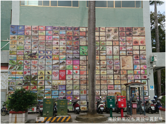 除了「小興苑」前衛的建築風格,拜訪中興新村的遊人很難不注意到鄰近的郵局:運用328枚郵票花樣所繪製的壁磚,組合成五彩繽紛的馬賽克郵票牆為2014年台灣燈會留下的藝術作品,和「小興苑」一般,充滿童趣且歷久彌新。此時,一輛總達客運巴士正好駛過光華路,這使我不禁想起大學時前往羅娜部落服務,路途中間從臺中車站到水里,偶爾會搭乘停靠中興新村的總達客運,不過那時只留意到林蔭大道,以及公車站旁矗立的路牌。