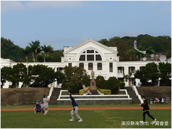 跨越中學路,來到中興會堂前的大操場。民國48年(1959)啟用,中興會堂是過往省政府接待外賓及元首的場所,後來也成為居民欣賞電影與藝文表演的空間;據說,中興會堂的造型靈感來自F-84噴射戰機,象徵勝利、起飛,建築左右對稱,入口門廊和立面的圓拱、柱廊、山牆大致上呈現新古典主義風格,民國100年(2011)登錄為歷史建築。