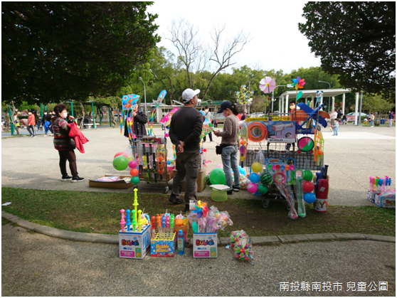 綠草如茵的大操場上,彩繪卡通人物圖案的風箏色彩斑斕,在溫暖微風中飛舞,飛舞風箏底下,人們相互追逐、嬉戲;鄰近中興會堂的兒童公園,街頭藝人即興演奏,孩童把玩手裡的紙風車,或是捕捉飄浮空中的肥皂泡泡,大人則圍坐樹下,品嚐烤玉米或者酸梅湯,盡享天倫之樂。 4.