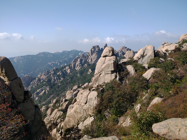 嶗山上常見一種植物結成串的紅果,在泰山上也有此種果實,屬於權木,濶葉,植物說明牌寫著雞樹條,雖不到秋天變色時刻但有紅果裝點也讓山頂增加不少顏色,過了巽門一定要往東極柱走,那是是欣賞巨峰之美的另一重要地景。 巨峰景區,充滿了嶗山石,在走一圈巨峰頂時,可以細細品味,所以強烈建議對地質感興趣的旅者,一定要走一敞巨峰景區,因為遊客來嶗山,通常都只會去太清景區和仰口景區。 今天提早完成登山,回程在台東街下車,找了間店面吃了雲吞湯,一碗20顆各式餡料,量足以當一頓晚餐,又買了嶗山可樂、百花蛇草水,可樂好喝但蛇草水有點怪不過不難喝,加買些吃食,回住宿區犒賞自己。 青島第三天,陰雨,上午還好,近中午下雨下得大,而且寒流來,幸好在泰山買了夾克,不然真抗不住這種溼冷,今天要走3個景區,所以得有取捨,太清走得簡單、仰口下來搭索道、華嚴比預期的好很多,幸好有走到那羅延窟,不然真的白來華嚴景區。