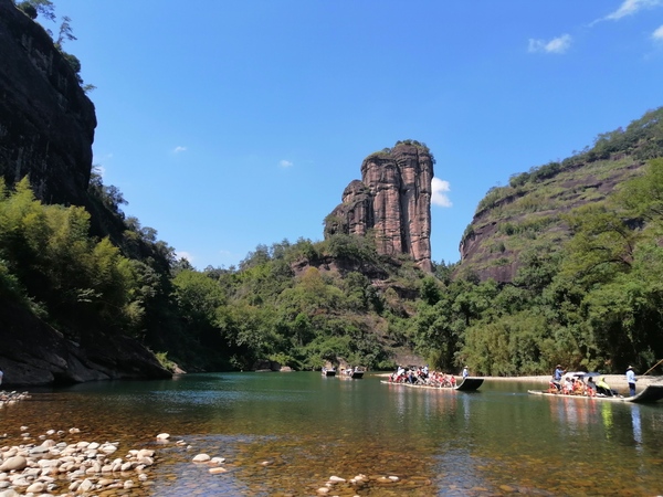 昨天未到止止庵,今天抽個空檔到武夷宮下車走敞止止庵,沿路遊客不多,而且美景多,竹筏漂流的最後一站也在附近下筏,如果搭筏是上午,倒是可以在下筏時再走到止止庵,也是行程最順的走法。 提早到竹筏碼頭,這裡的東西,物價不貴,像是離開景區的價位,也有吃合餐的餐廳,碼頭邊的攤販賣的東西價位都不高(對我而言),其中有一位年輕女孩,賣武夷山岩茶,岩茶是茶樹長在岩壁區,茶香甘甜,是極品茶,她一包賣4塊錢,一包大概是一次性泡茶的量,我買了些當禮物送台灣喝茶的朋友,辨別台灣茶與武夷茶的不同,我個人喝,覺得没什麼特別,還是台灣茶比較香醇好喝。 提早到碼頭也提早搭上竹筏,一路由撐船的師父講解,一人解說費是20元,下船收取(可以用微信支付),以下是九曲溪由九曲到一曲的風景集合~