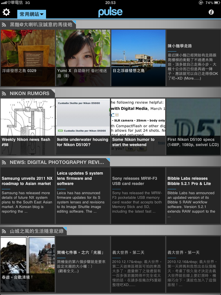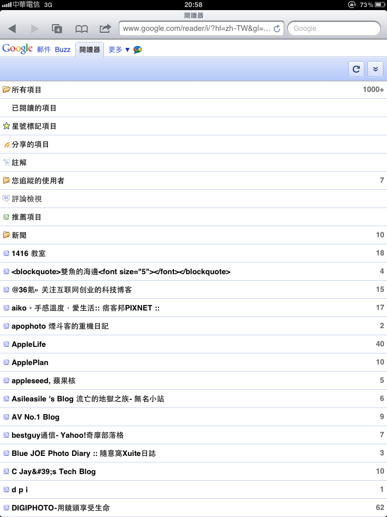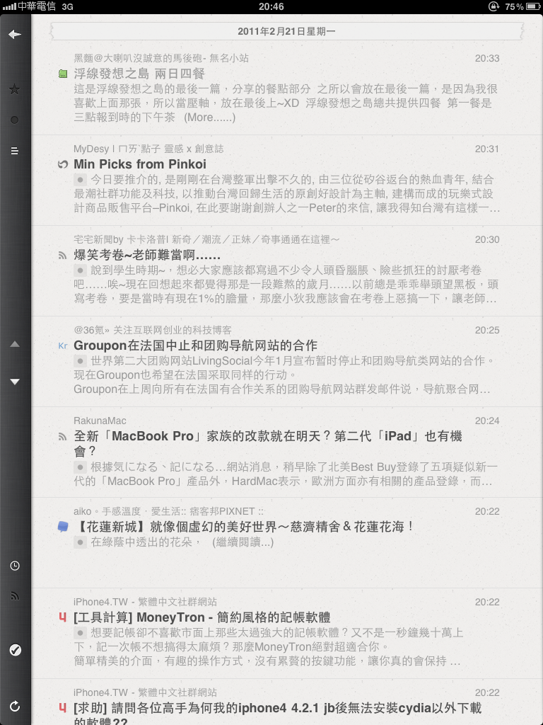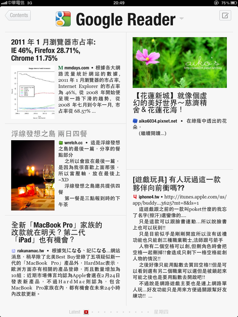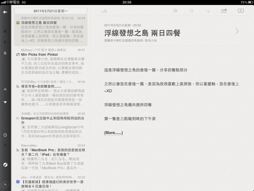 ![]() 自從買了 iPad 後,開始喜歡用 RSS 去閱讀網路上的文章 這樣的好處就是可以把所有的網站文章一次讀完,不用多花時間去開來開去 ![]() 上面這個是GOOGLE閱讀器的版面,感覺就很亂 ![]() 看文章的介面,感覺就是很不順眼~雖然可以看就是了~XD 人嘛,就是視覺性動物,天性如此,所以我又才會想在這邊介紹我常用的三套軟體給大家 ![]() 第一套是 Flipboard,光看上面那張,就很爽了吧~感覺就很漂亮阿,而且是會動的喔! 這軟體有得過獎,特色就是畫面很華麗,閱讀的感覺很像在看雜誌 ![]() 他可以把RSS的來源分成一格一格的,可以自己做修改 ![]() 也支援使用GOOGLE的標籤群組,可以自己分類以後更方便閱讀 ![]() 點進去以後就變成這樣,看起來很像報紙,或是雜誌的風格吧~ 看到中意的就點進去看 ![]() 進去會先看到摘要 ![]() 喜歡的話也可以發佈到其他地方 ![]() 想看全文的話,就點標題,可以連到網站去看全文 不過這是國內一些網誌服務才需要這樣,國外或是比較大的網站就可以直接在預覽頁看到全文,不用再點一次了 ![]() 放橫的以後,版面也會有所改變喔 ![]() 用來看 Facebook 很漂亮喔~XD ![]() 拿來看 Flickr 一樣爽度滿點阿! ![]() 第二套是 Reeder ![]() 也支援標籤的群組分類喔! 他的界面就很簡樸了,點進去以後就跟 iPad 的相簿很像 ![]() 開起來以後就是這樣,都是標題,沒有圖 ![]() 點第一次一樣是預覽 ![]() 再點第二次就是讀全文囉 ![]() 遇到喜歡的文章,有很多分享方式可以 PO 到網路上去喔! ![]() 一樣,對國內網誌的文章可能要多點一次才能看全文,不過對於一些資訊網站的文章,在預覽時就可以看完囉,很方便1 ![]() 放橫的會有不一樣的版面編排,也很方便閱讀喔 ![]() 第三套是 Pulse News 這套的版面也蠻美的,而且看起來很清楚 ![]() 一樣點文章就可以看預覽 ![]() 再點一次看全文 ![]() 放橫的一樣可以有不一樣的編排方式,也蠻方便閱讀的 以上三套,我都有留在我的 iPad 上面,因為各有不同的用途 Flipboard 是用在沒有特殊目的,就單純的隨意瀏覽,看看有沒有啥驚奇的時後,看爽用的 Reeder 是用在要專心閱讀時用的,這套版面很素,不過文章的載入速度很快,版面也很乾淨,適合長時間閱讀 Pulse News 則只有五頁,一頁12個RSS來源的限制,所以就放我最常逛的網站,適合速戰速決的時後用囉~^_* 這種軟體其實很像以前讀取新聞的軟體,只是他是統合各網站,更方便而已 我現在喜歡在上洗手間時,開車等紅綠燈時,陪藍瑛洗碗時來看這些東西,就是多利用零碎的時間 用到現在,開網頁瀏覽器的時間就少很多了,因為網站的內容幾乎都在這些時候看完了 剩下來的時間可以拿來做更有意義的事,我覺得這樣很棒,所以在這邊跟大家分享這個經驗囉~^_* |