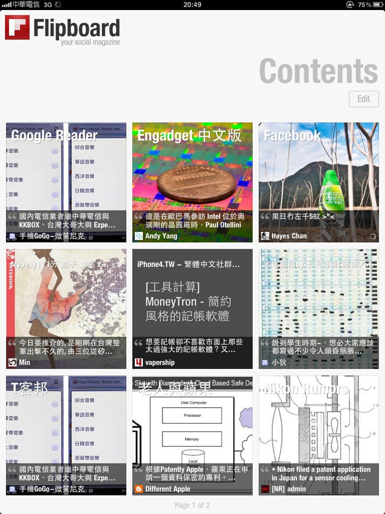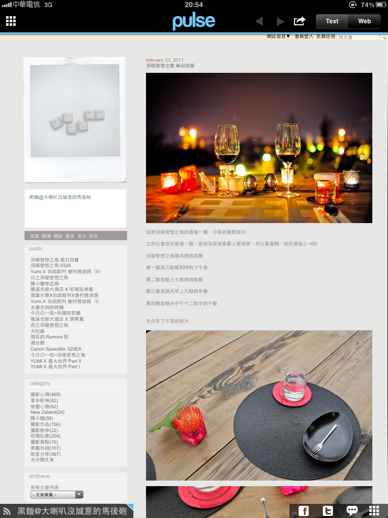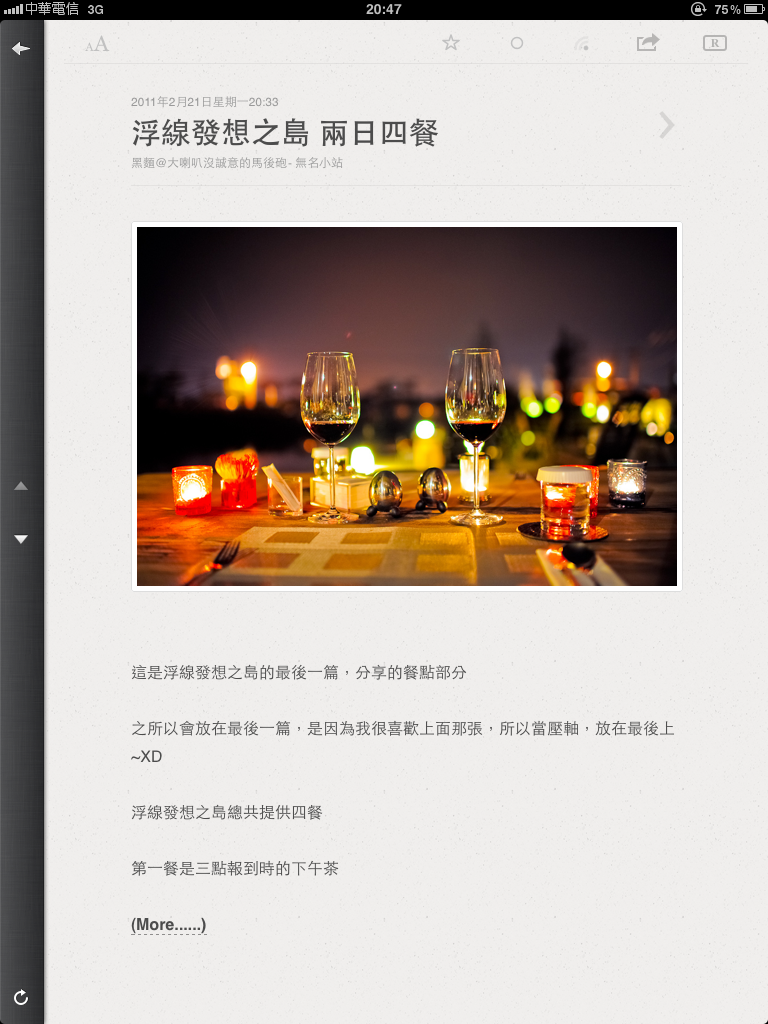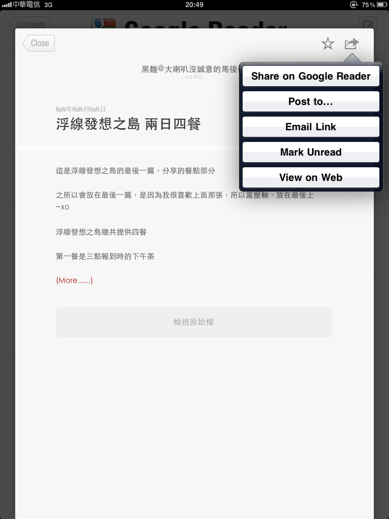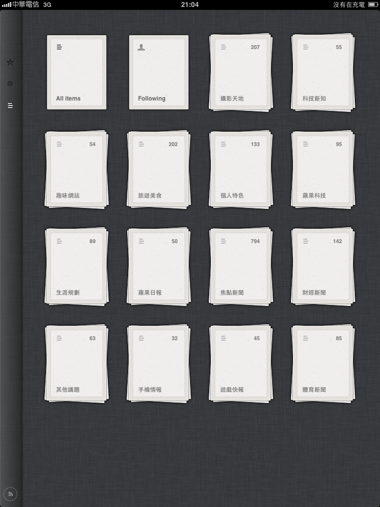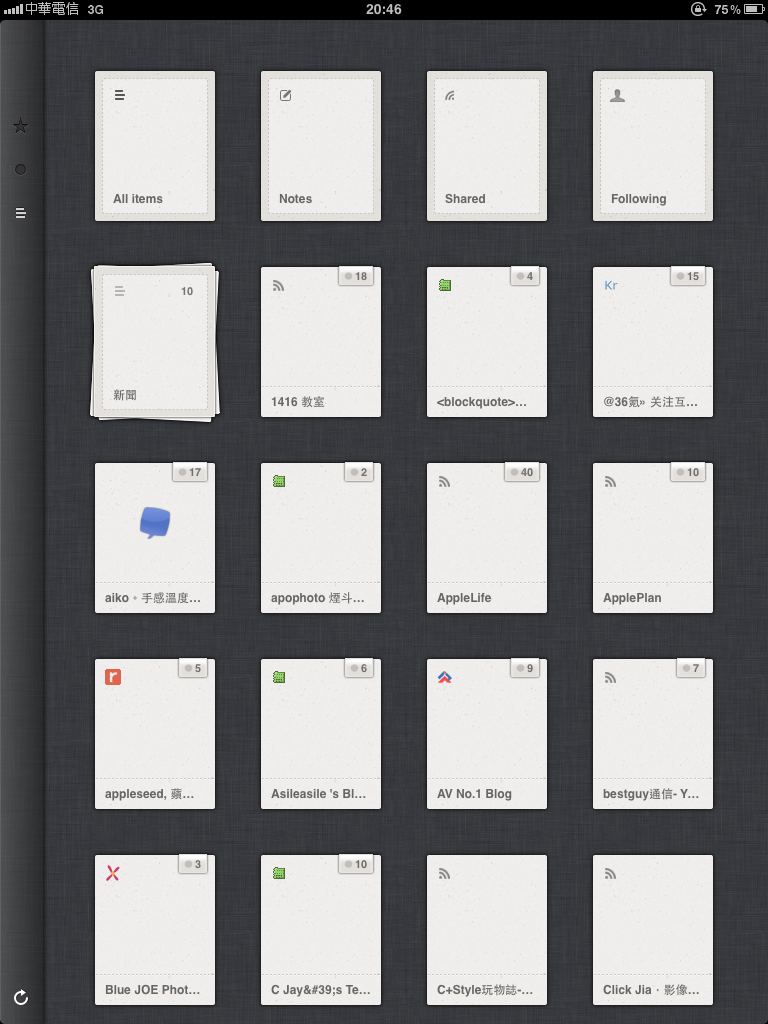![]() 自從買了 iPad 後,開始喜歡用 RSS 去閱讀網路上的文章 這樣的好處就是可以把所有的網站文章一次讀完,不用多花時間去開來開去 ![]() 上面這個是GOOGLE閱讀器的版面,感覺就很亂 ![]() 看文章的介面,感覺就是很不順眼~雖然可以看就是了~XD 人嘛,就是視覺性動物,天性如此,所以我又才會想在這邊介紹我常用的三套軟體給大家 ![]() 第一套是 Flipboard,光看上面那張,就很爽了吧~感覺就很漂亮阿,而且是會動的喔! 這軟體有得過獎,特色就是畫面很華麗,閱讀的感覺很像在看雜誌 ![]() 他可以把RSS的來源分成一格一格的,可以自己做修改 ![]() 也支援使用GOOGLE的標籤群組,可以自己分類以後更方便閱讀 ![]() 點進去以後就變成這樣,看起來很像報紙,或是雜誌的風格吧~ 看到中意的就點進去看 ![]() 進去會先看到摘要 ![]() 喜歡的話也可以發佈到其他地方 ![]() 想看全文的話,就點標題,可以連到網站去看全文 不過這是國內一些網誌服務才需要這樣,國外或是比較大的網站就可以直接在預覽頁看到全文,不用再點一次了 ![]() 放橫的以後,版面也會有所改變喔 ![]() 用來看 Facebook 很漂亮喔~XD ![]() 拿來看 Flickr 一樣爽度滿點阿! ![]() 第二套是 Reeder ![]() 也支援標籤的群組分類喔! 他的界面就很簡樸了,點進去以後就跟 iPad 的相簿很像 ![]() 開起來以後就是這樣,都是標題,沒有圖 ![]() 點第一次一樣是預覽 ![]() 再點第二次就是讀全文囉 ![]() 遇到喜歡的文章,有很多分享方式可以 PO 到網路上去喔! ![]() 一樣,對國內網誌的文章可能要多點一次才能看全文,不過對於一些資訊網站的文章,在預覽時就可以看完囉,很方便1 ![]() 放橫的會有不一樣的版面編排,也很方便閱讀喔 ![]() 第三套是 Pulse News 這套的版面也蠻美的,而且看起來很清楚 ![]() 一樣點文章就可以看預覽 ![]() 再點一次看全文 ![]() 放橫的一樣可以有不一樣的編排方式,也蠻方便閱讀的 以上三套,我都有留在我的 iPad 上面,因為各有不同的用途 Flipboard 是用在沒有特殊目的,就單純的隨意瀏覽,看看有沒有啥驚奇的時後,看爽用的 Reeder 是用在要專心閱讀時用的,這套版面很素,不過文章的載入速度很快,版面也很乾淨,適合長時間閱讀 Pulse News 則只有五頁,一頁12個RSS來源的限制,所以就放我最常逛的網站,適合速戰速決的時後用囉~^_* 這種軟體其實很像以前讀取新聞的軟體,只是他是統合各網站,更方便而已 我現在喜歡在上洗手間時,開車等紅綠燈時,陪藍瑛洗碗時來看這些東西,就是多利用零碎的時間 用到現在,開網頁瀏覽器的時間就少很多了,因為網站的內容幾乎都在這些時候看完了 剩下來的時間可以拿來做更有意義的事,我覺得這樣很棒,所以在這邊跟大家分享這個經驗囉~^_* |