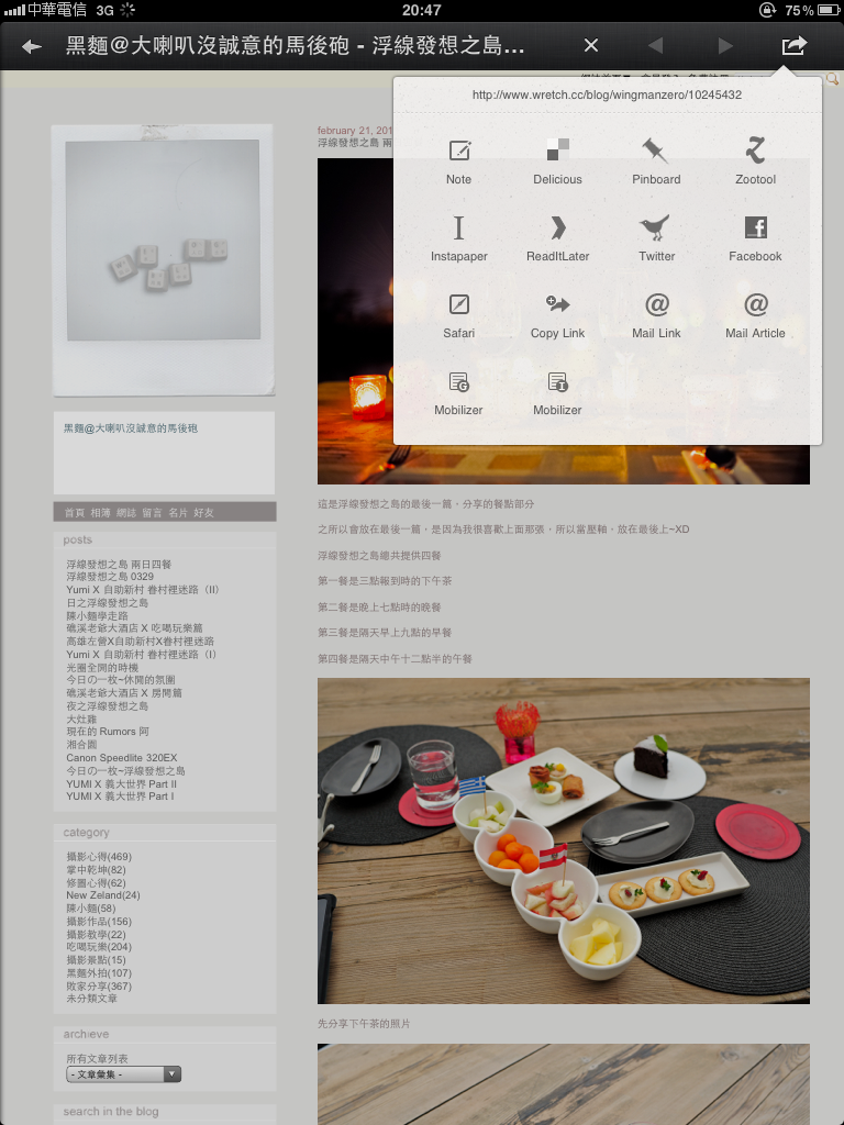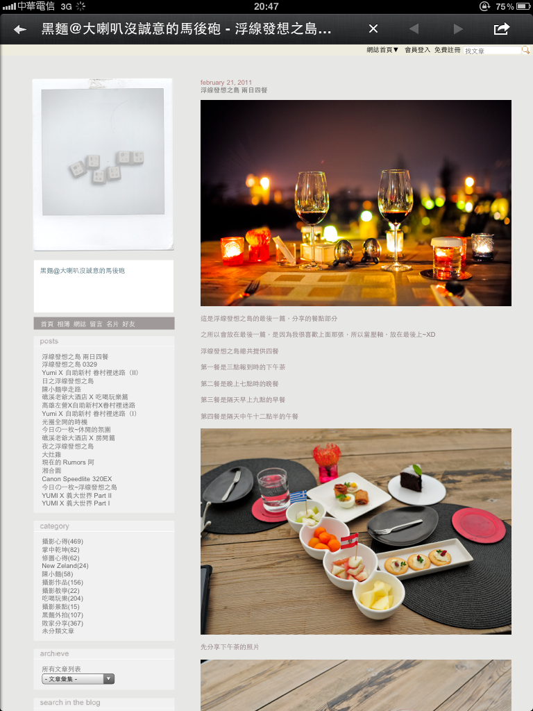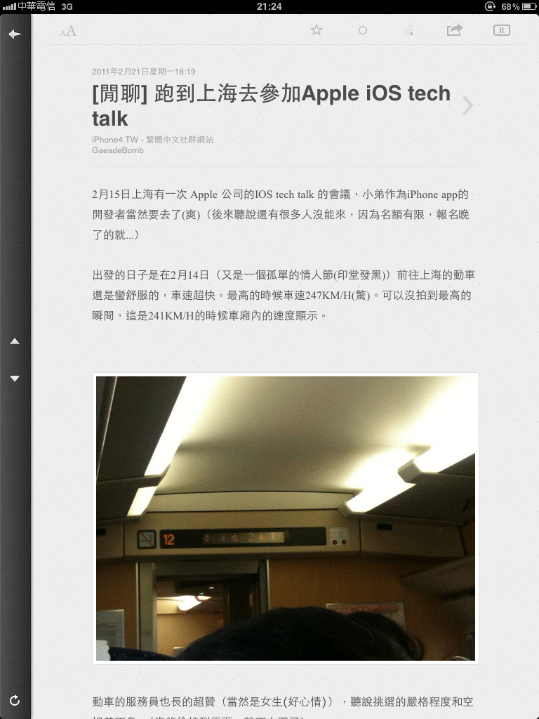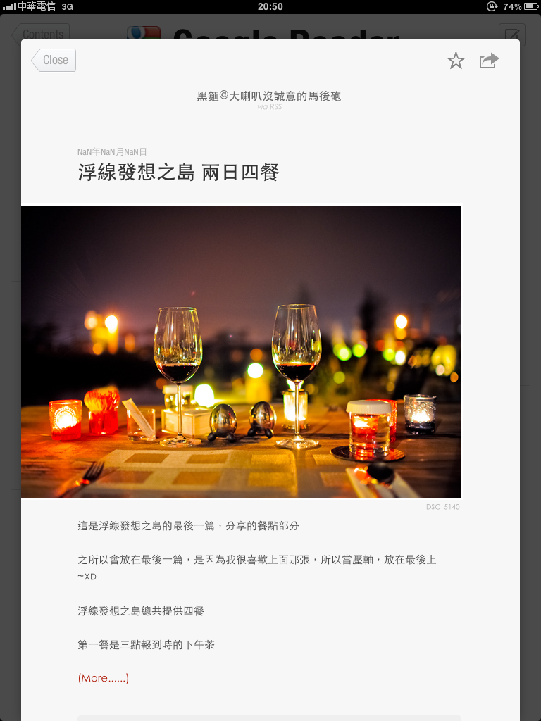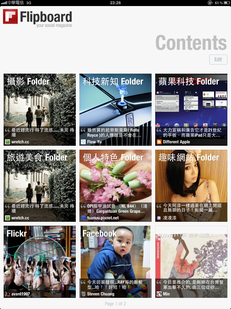 ![]() 自從買了 iPad 後,開始喜歡用 RSS 去閱讀網路上的文章 這樣的好處就是可以把所有的網站文章一次讀完,不用多花時間去開來開去 ![]() 上面這個是GOOGLE閱讀器的版面,感覺就很亂 ![]() 看文章的介面,感覺就是很不順眼~雖然可以看就是了~XD 人嘛,就是視覺性動物,天性如此,所以我又才會想在這邊介紹我常用的三套軟體給大家 ![]() 第一套是 Flipboard,光看上面那張,就很爽了吧~感覺就很漂亮阿,而且是會動的喔! 這軟體有得過獎,特色就是畫面很華麗,閱讀的感覺很像在看雜誌 ![]() 他可以把RSS的來源分成一格一格的,可以自己做修改 ![]() 也支援使用GOOGLE的標籤群組,可以自己分類以後更方便閱讀 ![]() 點進去以後就變成這樣,看起來很像報紙,或是雜誌的風格吧~ 看到中意的就點進去看 ![]() 進去會先看到摘要 ![]() 喜歡的話也可以發佈到其他地方 ![]() 想看全文的話,就點標題,可以連到網站去看全文 不過這是國內一些網誌服務才需要這樣,國外或是比較大的網站就可以直接在預覽頁看到全文,不用再點一次了 ![]() 放橫的以後,版面也會有所改變喔 ![]() 用來看 Facebook 很漂亮喔~XD ![]() 拿來看 Flickr 一樣爽度滿點阿! ![]() 第二套是 Reeder ![]() 也支援標籤的群組分類喔! 他的界面就很簡樸了,點進去以後就跟 iPad 的相簿很像 ![]() 開起來以後就是這樣,都是標題,沒有圖 ![]() 點第一次一樣是預覽 ![]() 再點第二次就是讀全文囉 ![]() 遇到喜歡的文章,有很多分享方式可以 PO 到網路上去喔! ![]() 一樣,對國內網誌的文章可能要多點一次才能看全文,不過對於一些資訊網站的文章,在預覽時就可以看完囉,很方便1 ![]() 放橫的會有不一樣的版面編排,也很方便閱讀喔 ![]() 第三套是 Pulse News 這套的版面也蠻美的,而且看起來很清楚 ![]() 一樣點文章就可以看預覽 ![]() 再點一次看全文 ![]() 放橫的一樣可以有不一樣的編排方式,也蠻方便閱讀的 以上三套,我都有留在我的 iPad 上面,因為各有不同的用途 Flipboard 是用在沒有特殊目的,就單純的隨意瀏覽,看看有沒有啥驚奇的時後,看爽用的 Reeder 是用在要專心閱讀時用的,這套版面很素,不過文章的載入速度很快,版面也很乾淨,適合長時間閱讀 Pulse News 則只有五頁,一頁12個RSS來源的限制,所以就放我最常逛的網站,適合速戰速決的時後用囉~^_* 這種軟體其實很像以前讀取新聞的軟體,只是他是統合各網站,更方便而已 我現在喜歡在上洗手間時,開車等紅綠燈時,陪藍瑛洗碗時來看這些東西,就是多利用零碎的時間 用到現在,開網頁瀏覽器的時間就少很多了,因為網站的內容幾乎都在這些時候看完了 剩下來的時間可以拿來做更有意義的事,我覺得這樣很棒,所以在這邊跟大家分享這個經驗囉~^_* |