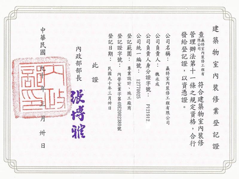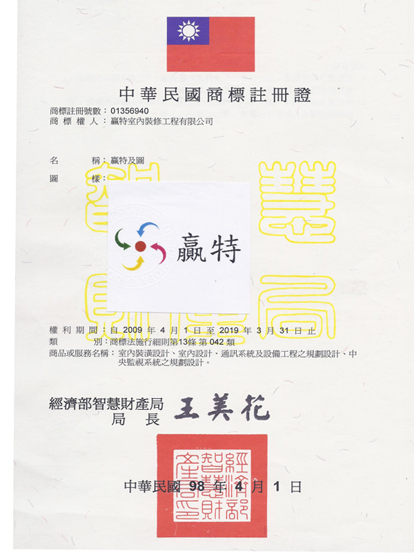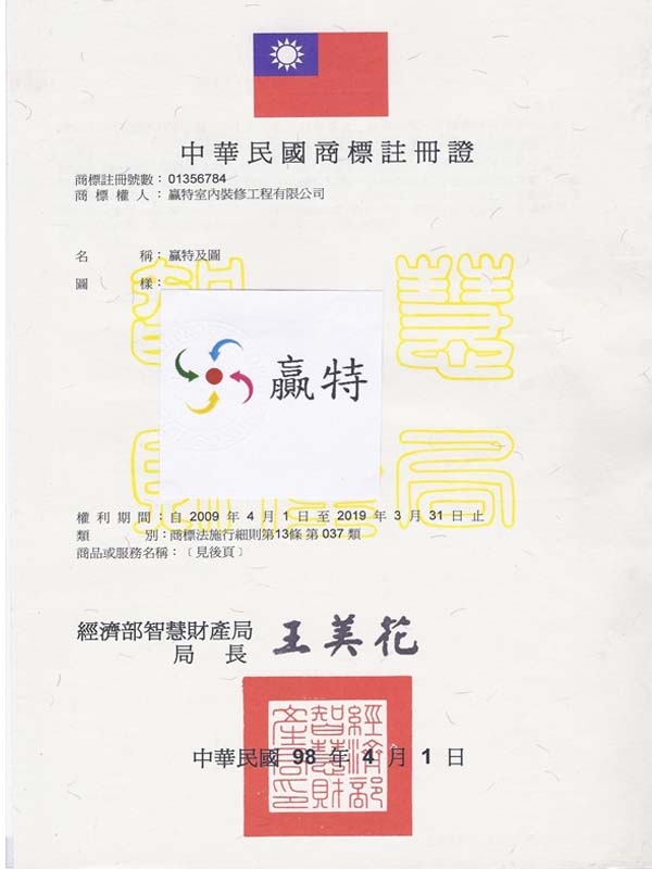為少數同時擁有 中華民國內政部頒發之 建築物室內裝修合格之室內設計及施工廠商之兩種專業登記證 並頒有 中華民國經濟部智慧財產局之商標註冊証(贏特01356784VS圖01356940)且具有勞委會認證之 勞工安全衛生教育證照----甲種業務主管證照 公司要求設計及施工上的優良品質 故以上,中,下,鍊之垂直整合 營運模式 贏特投入大量資金及人力獨自經營 (1)室內設計公司(2)室內裝潢/璜公司集(3)百坪工廠....這些足以證明 贏特非常愛惜羽毛 絕不偷工減料 以提升對客戶之服務品質,,杜絕如:同業因發包而產生之下游廠商偷工,減料之不良行為 並以 服務 創新誠信責任 之理念為公司營運之宗旨 祈能以 真誠專業實力 再這一片亂象叢生的業界 脫穎而出 樹立一支大多數人均知道的優良品牌 贏特只收取工程款的百分之十作為服務費 贏特室內裝修工程有限公 敬上