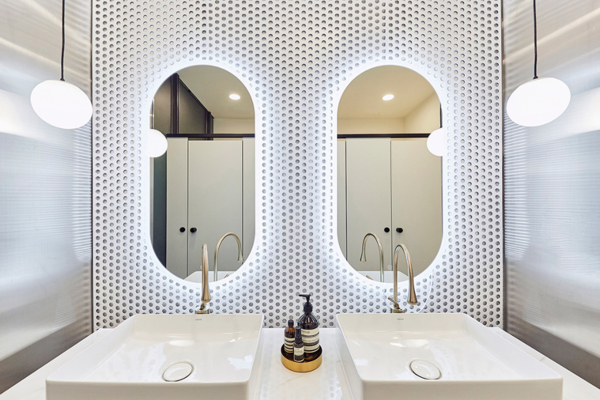 空間細節從梯廳起始,兩側冷冽的金屬飾板弧形牆穿插著燈光效果,以最少限度的裝飾手法,將空間瞬化成開啟時尚之旅的伸展台。再到頂樓梯廳,如幻化成另一處宇宙時空,四面皆以黑鏡混搭金屬天花,充滿強調舞台效果的冷冽映射。