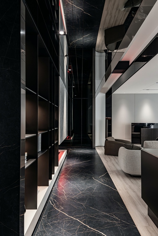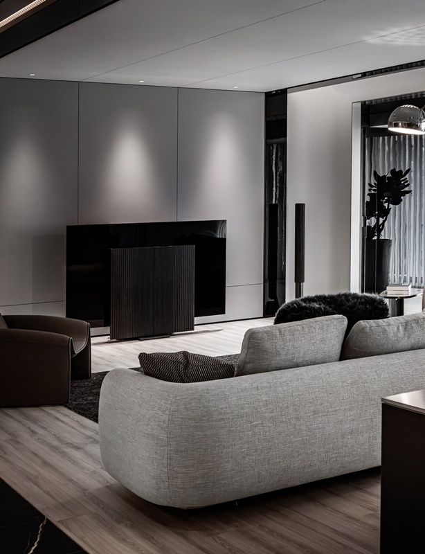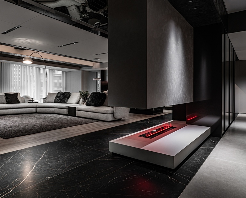 光紋輕喃 空間動線以整合為策略,將客廳、走道與閱讀休憩區串聯為連續而開闊的生活場域。廊道以冷調藝術漆鋪陳,光線沿牆面推進,如剪裁般收斂視線,形成一條靜謐而具縱深感的通道,為居者鋪展進入日常的過渡節奏。行走其間,視線不被切割,而是隨著材質轉換與光影變化自然延展,使每一步都成為緩慢而穩定的感知體驗。 客廳作為公共核心,以黑、灰、白為基調,呈現沉穩內斂的現代氣質。黑色大理石紋地坪與溫潤木地板交錯鋪陳,建立理性與溫度並存的場域表情。素面灰色電視牆與局部鏡面天花相互映照,延展高度與空間深度。懸浮式壁爐則成為溫暖的中介節點,在界定空間的同時,也保留視線的連續流動。弧形布質沙發搭配大面積地毯,以柔和姿態圍塑出包覆感。