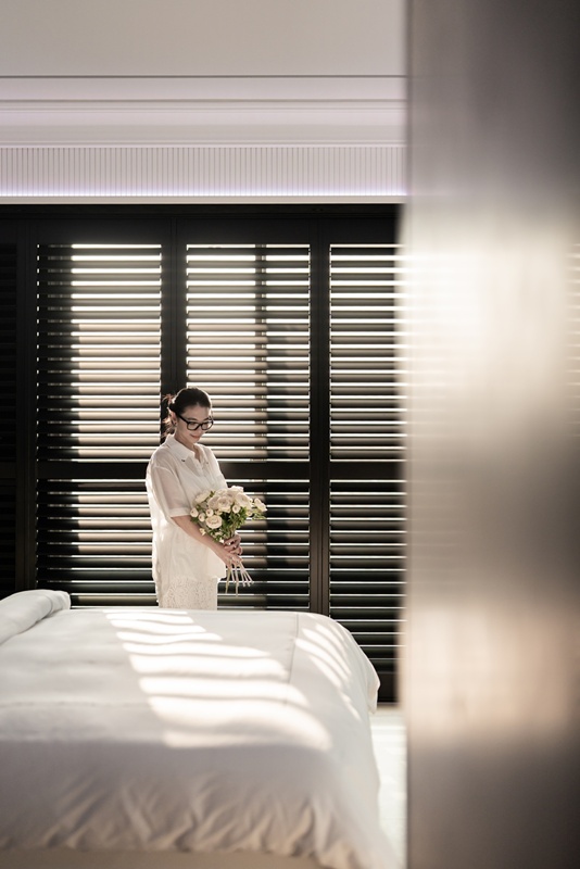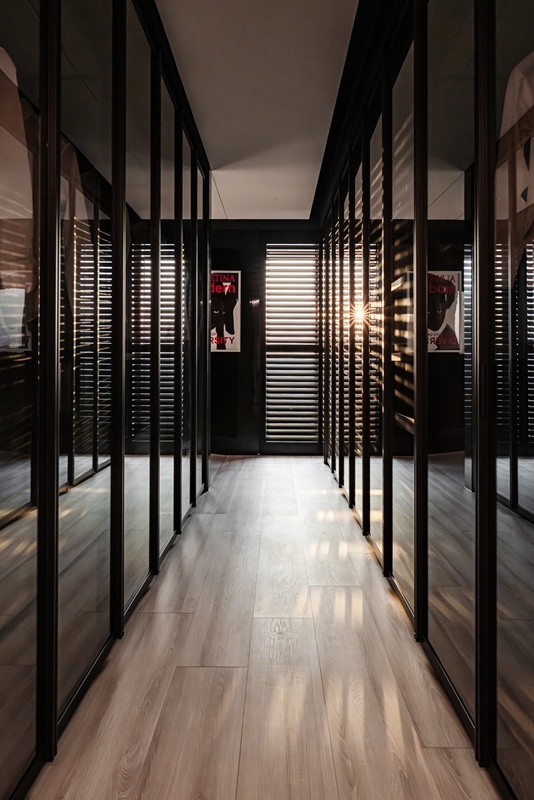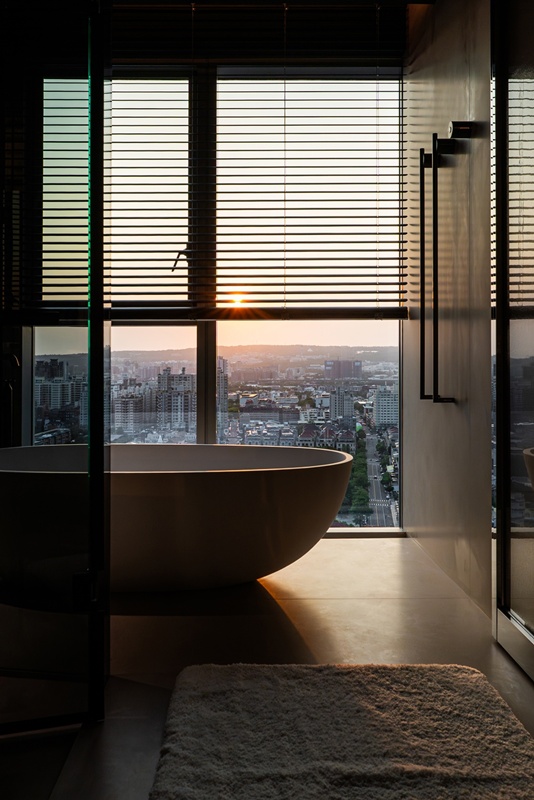 黑白織就 更衣室以對稱的一字型動線展開,如精品陳列般鋪陳日常儀式。黑色框構與通透玻璃在光線引導下展現層次變化,讓收納轉化為視覺秩序的一部分。光線由盡端窗面引入,百葉窗灑落的光影投射於木地板上形成節奏分明的線性構圖,使行走其中成為從容的日常片段。浴室延續靜謐語彙,面向城市天際線展開,霧面灰階材質與蛋型浴缸構築安定而內斂的場景,橫向百葉窗調節夕陽光影,使沐浴成為一段與城市對話的靜謐時刻。設計聚焦於時間的延續性,讓空間隨時間推移而持續被感受。當形式退後,材質與比例便安靜地承接情緒,成為一處讓人回到自我感受的生活場域;靜謐之中,力量不張揚卻長久存在。