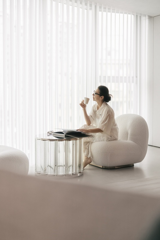 韌性餘響 臥室回歸純粹,黑與白的對比在光影變化中展現層次深度。細緻白色線板天花勾勒清晰輪廓,構築穩定的上方界線並注入層次感。黑色木質百葉折門引光入室,線性光影在潔白之中游移,讓空間在靜止中保有動態節奏。灰色地坪以溫潤觸感平衡整體視覺張力,讓休憩空間在簡約之中保有細膩的情緒流動。 閱讀休憩區位於採光極佳的一隅,大面落地窗的光線經由柔紗簾過濾,轉化為柔和的霧面光感,羊羔絨單椅與透明玻璃圓几靜靜佇立,時間悄然停駐,為閱讀與靜心留下一段安靜的時間縫隙。整體設計在理性結構之中刻意留出情感的餘白,使動線、視線與材質不再強調功能,而是自然成為日常的背景。空間不以隔斷界定場域,尺度與光線得以自行展開,生活狀態於其中綿延。