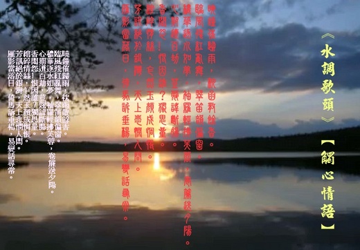 《水調歌頭》【觸心情語】曉鐘催歸雨,枕函散餘香。臨風殘紅亂舞,翠笛韻偏窗。穠華逐水如夢,袖羅輕拂芙蓉,卷簾送夕陽。心期遭百劫,荳蔻諱斷腸。香閣怨﹗恨因誰?獨思量。綰碎情絲,乍然玉顏成惆悵。芳訊絕於銀灣,天上悲憫人間。雁影當落日,倚馬訴垂楊,易變話尋常。