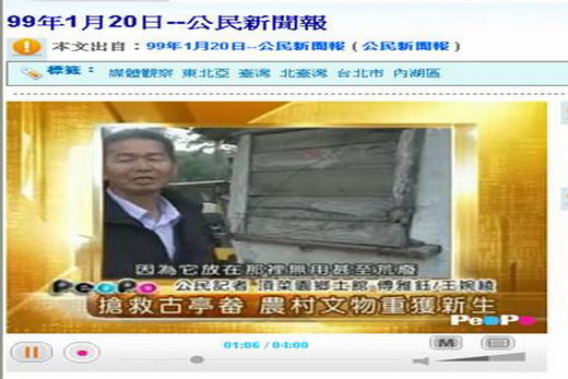 (搶救農村文物-古亭畚)被公共電視,「PeoPo公民新聞報」報導在台灣甚至世界各地公民觀點的新聞。