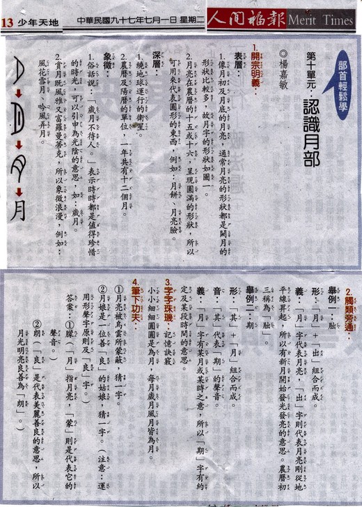 表層: 1.像月初及月底的月亮,通常月亮的形狀都是闕月的形狀比較多,故月字的形狀如圖一。 2.月亮在農曆的十五或十六,呈現圓滿的形狀,所以可用來代表圓形的東西,例如:月餅、月亮臉。 深層: 1.繞地球運行的衛星。 2.農曆及陽曆的單位,一年共有十二個月。 象徵: 1.俗話說:「歲月不待人。」表示時時都是值得珍惜的時光,可以引申為光陰的意思,如:歲月。 2.賞月既風雅又富羅曼蒂克,所以象徵浪漫,例如:風花雪月、吟風弄月。 觸類旁通: 舉例一:朏 形:「月」+「出」組合而成。 義:「月」字代表月亮,「出」字則代表月亮剛從地平線昇起,所以有新月開始發光發亮的意思。農曆初三稱為「朏」。 舉例二:期 形:「其」+「月」組合而成。 音:「其」代表「期」的聲音。 義:「月」字有某月或某時之意,所以「期」字有約定及某段時間的意思。 3.字字珠璣:記憶訣竅 小小細細圓圓是為月,每月歲月風月皆為月。 4.筆下功夫: {1}月亮被烏雲所蒙蔽,猜一字。 {2}月娘是一位善「良」的姑娘,猜一字。(注意:運用形聲字原則及「良」字。) 答案:{1}朦(「月」指月亮,「蒙」則是代表它的聲音。) {2}朗(「良」是代表美麗善良的意思,所以月光明亮良善為「朗」。) |