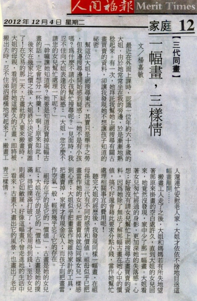 最近在外面上課時,認識一位年約六十多歲的大姐,由於她常常坐在我的旁邊,於是漸漸地熟稔起來。有一次,她拜託我幫她上網搜尋有關古畫買賣的資料,卻讓我發現她不想讓孩子知道的祕密。 幫這位大姐上網搜尋東西,其實只是舉手之勞,但我邊搜尋邊開始感到疑惑:「她不是有小孩嗎?為什麼不請小孩幫忙搜尋呢?」見面時,我忍不住向大姐表達我的疑惑:「大姐,您怎麼不請您的女兒幫忙處理一下呢?」 「幹嘛讓她知道啊?她要是知道我賣掉這幅古畫的話,一定會想分一杯羹!」啊!原來如此! 後來在幾家比價之後,大姐終於決定要賣給誰了!在交易的那一天,古畫社的人要來搬畫時,大姐的母親,看到陪伴她這麼久的古畫,即將被搬出去時,忍不住涕泗縱橫地哭起來了,搬畫工人還連忙安慰老人家,大姐才依依不捨地目送這幅畫離開…… 搬畫工人走了之後,大姐和媽媽若有所失地望著那原來掛畫的空白處許久,直到大姐的女兒回來,她竟然沒發現,家中少了那一幅畫。大姐看著女兒匆忙經過的身影,更加深她的失落感。心想:好險沒有請女兒幫忙上網搜尋古畫買賣的資料,因為她除了無法了解那幅古畫在她心中的價值,搞不好還會藉此要求分點小錢,當作她幫忙處理相關事宜的費用呢! 聽完大姐的經歷後,我發現同樣一幅畫,在祖母孫這三代有不同的感情和價值。祖母似乎已把畫當作她的女兒,把畫賣掉就如同嫁女兒一樣感到心疼;大姐似乎把畫當作她維持家計的工具,把畫賣掉,家裡才有現金收入;而孩子則把畫當作空氣一般,輕到幾乎忘了它的存在。 祖母在乎的是它的「價值」,古畫是她的女兒紅;大姐在乎的是它的「價格」,古畫是她的撲滿,得把撲滿打破了,才能用得到錢;至於女兒則視它如敝屣,好像這幅畫不曾走進她的生活中。看來,古畫不只畫出它的風景,也畫出了老中青三樣情。 還有其他問題請上 1.<超解心經> http://www.books.com.tw/products/0010686516 2.<玩出生活語文力> http://www.kingstone.com.tw/book/book_page.asp?kmcode=2015280573678&lid=search&actid=wise 3.<懂這些訣竅,火速飆升作文力> http://www.kingstone.com.tw/book/book_page.asp?kmcode=2015240100067&lid=search&actid=wise 4.<沒有孩子願意變壞> http://www.kingstone.com.tw/book/book_page.asp?kmcode=2015280542285&lid=search&actid=wise 5.<搶救無感宅小孩> http://www.kingstone.com.tw/book/book_page.asp?kmcode=2015280562849&lid=search&actid=wise