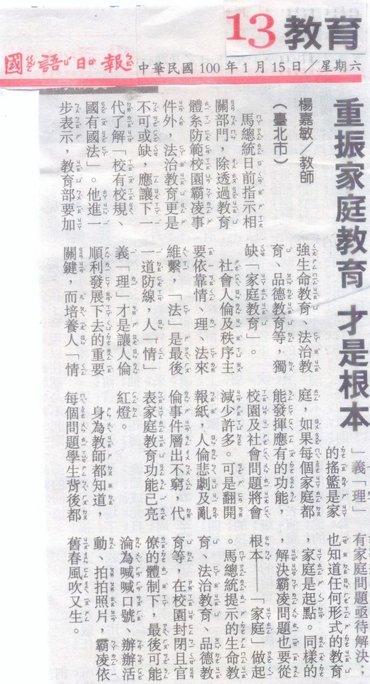 1/5馬總統指示政府相關部門,除透過教育體系防範校園霸凌事件外,法治教育更是不可或缺,應讓下一代了解校有校規,國有國法。馬總統進一步表示,教育部要加強生命教育、法治教育、品德教育等,獨缺「家庭教育」! |