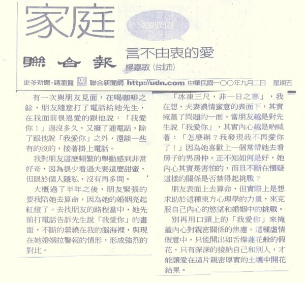 大概過了半年之後,朋友緊張的要我陪她去算命,因為她的婚姻亮起紅燈了。去找朋友的路程當中,她先前打電話告訴先生說「我愛你」的畫面,不斷的縈繞在我的腦海裡,與現在她婚姻拉警報的情形,形成強烈的對比。