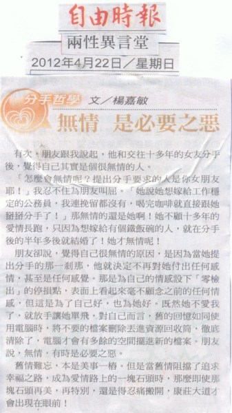 朋友卻說,覺得自己很無情的原因,是因為當她提出分手的那一剎那,他就決定不再對她付出任何感情,甚至是任何感覺。那是為自己的情感設下「零檢出」的停損點,表面上看起來毫不顧念之前的任何情感,但這是為了自己好,也為她好。既然她不愛我了,就放手讓她單飛,對自己而言,舊的回憶如同使用電腦時,將不要的檔案刪除丟進資源回收筒,徹底清除了,電腦才會有多餘的空間擺進新的檔案。朋友說,無情,有時是必要之惡。