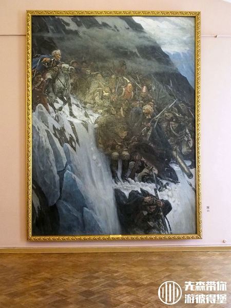 穿過54號廳,我們會進入懸掛著蘇裡科夫巨幅畫作《1799年蘇沃洛夫穿越阿爾卑斯山》和《攻陷雪城》所在的大廳。