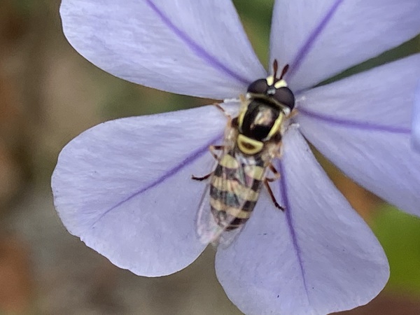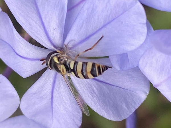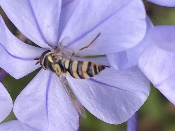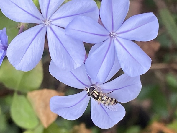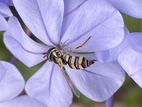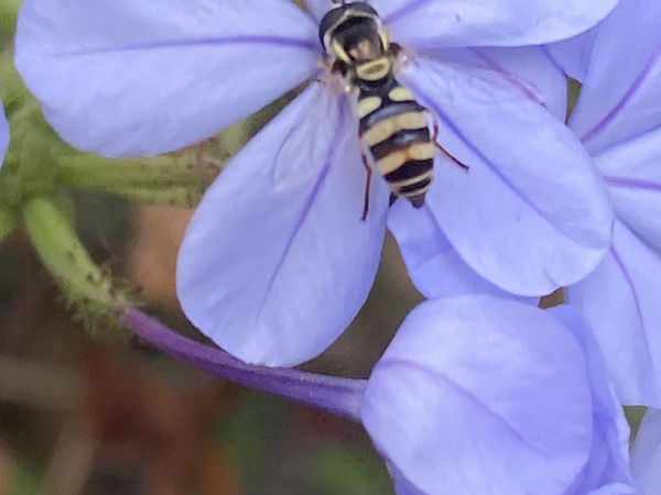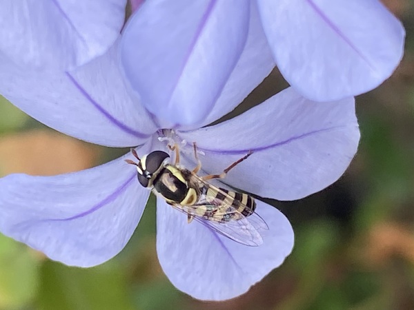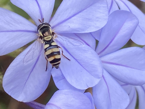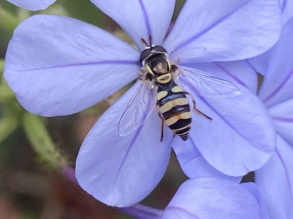 正在採取藍雪花蜜的本是蜜蜂喔!牠是食蚜蠅屬的昆蟲