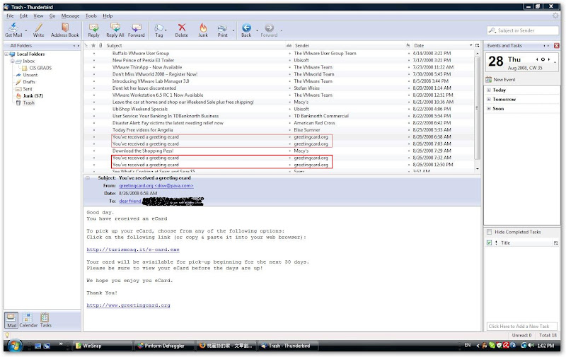沒多久前有垃圾郵件假冒是CNN 的頭條新聞,現在又有假冒是電子卡片希望你從連結去收你的卡片。![]() 當我收倒這郵件時,只看了5 秒就砍倒垃圾夾裡面了,沒想到竟然有很多人被騙,我只能說垃圾郵件做的越來越精緻,已經幾乎要和每個人的上網習慣息息相關了,像我大部分的郵件附加檔我都是不收的直接殺掉,之前新聞有介紹如何避免垃圾郵件,但是科技一直在進步,垃圾郵件商,駭客等等進步的又更快,如果只是按照新聞上的原則那你已經落後人家一大步了,最好的方法還是自己要注意小細節,保持好的電腦使用習慣,我有個朋友電腦的病毒掃不完,問我要怎麼?我說停止下載A片是個好辦法!! 念資訊最辛苦的一件事.....就是幫親朋好友修電腦掃病毒等等,特別是放假去親戚家或朋友家玩的時候,突然有人問,咦你電腦很不錯喔,我電腦怪怪的,來幫我看看好不好,這一看都是痛苦的開始阿~~希望大家都能好好的愛惜自己的電腦,不要常常去麻煩你們的宅朋友了!! |