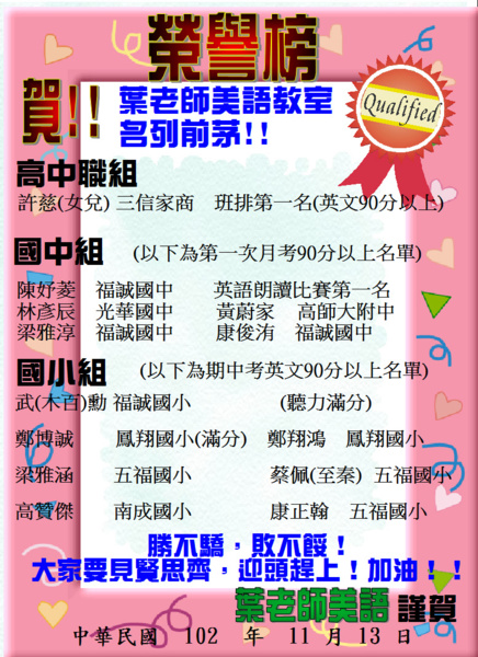 恭喜本校學員102下第二次月考表現優良!
