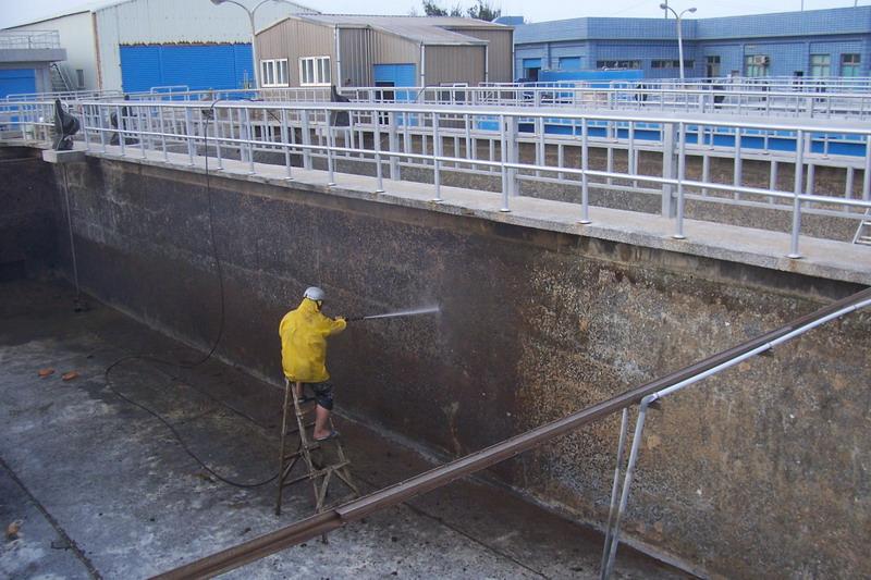 圖三、高壓水清洗,將菁苔及其它附著在水池壁面的髒污清洗。