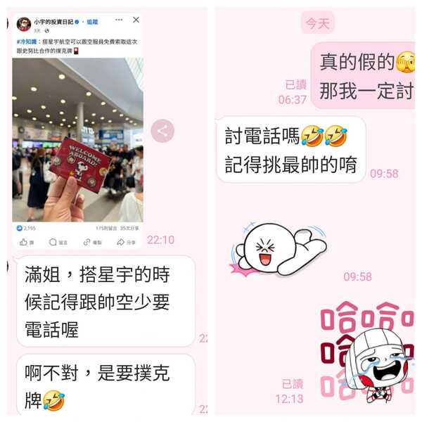 我的同仁叫我記得討“撲克牌” 有人說搭乘星宇航空先來跟空少討個電話 不是啦!是討個撲克牌啦!是不同凡響的史努比喔!我真的一上飛機就討,馬上得到一個 。