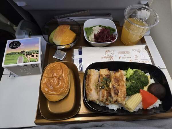 夜間飛行 回國時同樣搭星宇航空,這次沒跟空少要電話,更正是討撲克牌啦 回來跟空姐要,空姐馬上留給我,給的是藍色的史努比,也是挺不錯的;我依然動作慢還是沒有喝到“”祕製特調酒“” 去時吃紅燒牛肉丼,回時吃紅燒雞腿也是可以!