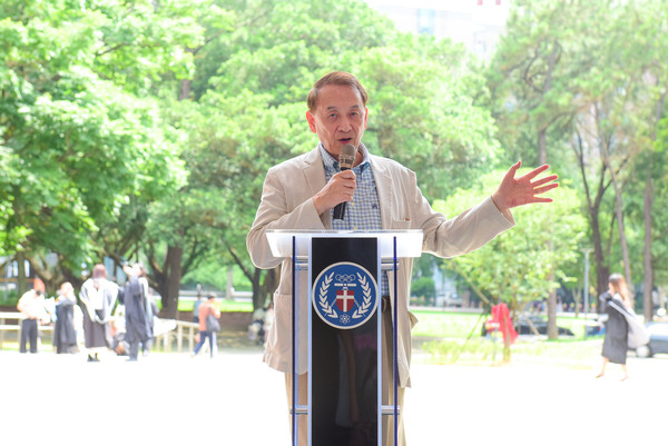 在捐贈揭牌儀式上,中原大學董事長張光正亦以博雅班授課教師身分出席並致詞。他回顧中原大學創校70年的歷程,強調「博愛、犧牲、奉獻」的創校精神歷久彌新,特別提及校園內自然景觀的美麗與珍貴。而本次種植新樹的構想,正是他與學生們共同發起,象徵世代傳承與對母校的深厚情感。 張光正講座教授現場朗讀詩意盎然的《Trees》中英文歌詞,緊接著由男高音袁長穗與鋼琴家陳文婉演繹同名樂曲,文學與音樂交織融合。博雅班畢業生楊蓁蓁在活動中朗讀《聖經》詩篇第一篇,詮釋植樹的意涵:「他要像一棵樹栽在溪水旁,按時候結果子,葉子也不枯乾。凡他所做的盡都順利。」象徵這棵櫻花樹庇蔭後學,延續中原的教育信念。
