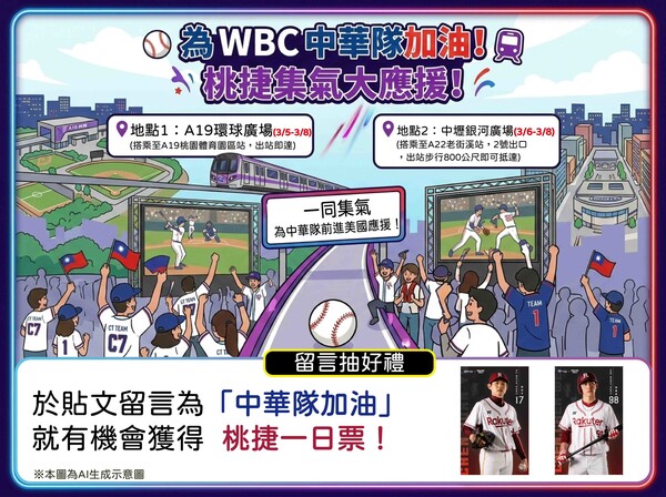 2026年世界棒球經典賽(WBC)將於3月5日在東京巨蛋熱血開打,中華隊再度踏上國際舞台迎戰強敵。桃園捷運公司結合桃園市政府力挺棒球、應援國家隊,特別推出即時賽況轉播及線上集氣活動,並串聯市府直播派對場地的交通服務,邀請球迷搭乘桃捷,一起為中華隊吶喊加油,讓整座城市化身最強後援團! 桃園市政府於3月5日至3月8日接連舉辦世界棒球經典賽直播派對,邀請市民及球迷共同為中華隊應援。3月5日開幕戰中華隊對戰澳洲,將於A19 Global Mall廣場率先直播;3月6日對日本、3月7日對捷克及3月8日對韓國三場賽事,則同步於市府府前廣場、A19 Global Mall廣場及中壢銀河廣場三地轉播。其中A19 Global Mall廣場與中壢銀河廣場皆可搭乘機場捷運順利抵達,球迷至A19桃園體育園區站下車出站即可直達應援現場;前往中壢銀河廣場則可於A22老街溪站2號出口出站後步行約800公尺抵達。透過完善便利的交通串聯,讓無法親赴日本觀賽的球迷,也能在直播派對感受熱血氛圍,齊心為中華隊集氣喝采。 為讓旅客也能即時掌握戰況,桃捷於全線車站啟動「WBC即時賽況跑馬轉播」,透過車站的旅客資訊顯示系統,以跑馬文字同步更新比賽資訊,打造捷運版即時文字轉播。在開賽前1小時起,每20分鐘推播對戰資訊,開賽後每5分鐘更新最新比數、攻守局數及戰況變化;而當中華隊擊出全壘打時,以快訊速報球員所攻下的分數,讓旅客即使身在機捷車站,也能同步感受球場上的熱血瞬間。