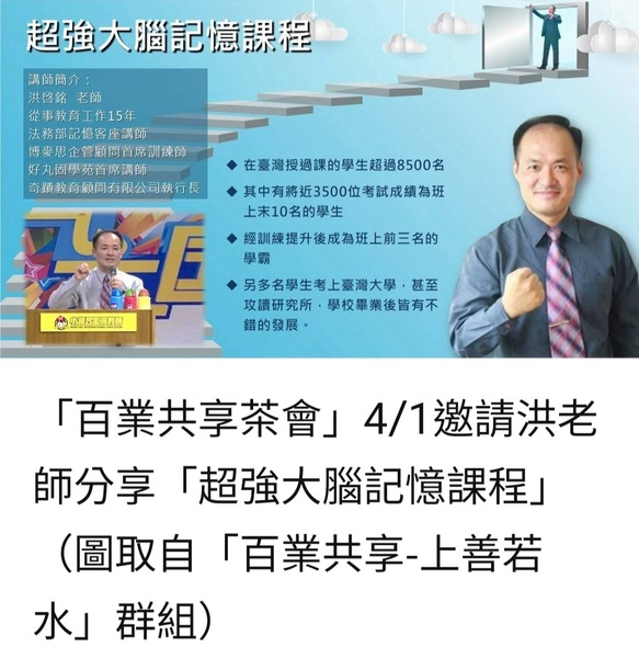 〔記者:張永勳 台北報導 115/03/29〕 由「百業共享互助系統西寧北分社」(以下簡稱「百業」)主辦每週三下午2:00-4:30的共享茶會,除了齊聚各行各業的人一起來認識「百業」的互助平台,4/1這天,也邀請到在教育領域15年,在台灣教授學生超過8500人.幫助近3500名在班上成績墊底的學生提升為班上前3名的洪啓銘老師來展示「超強大腦記憶課程」。 「百業」源於- 美國麻省理工學院的幾位清寒學生,因為繳不起學費而發起,每人出50元美金來互助,透過集資與倍增的力量,不但能順利,而且有了創業基金。 「百業」引入台灣- 在2014年6月正式啓動,2022年7月改良為2.0升級版,互助效果更升級。 會員夥伴三大權益- 1.自我廣告 2.資源共享 3.互助系統