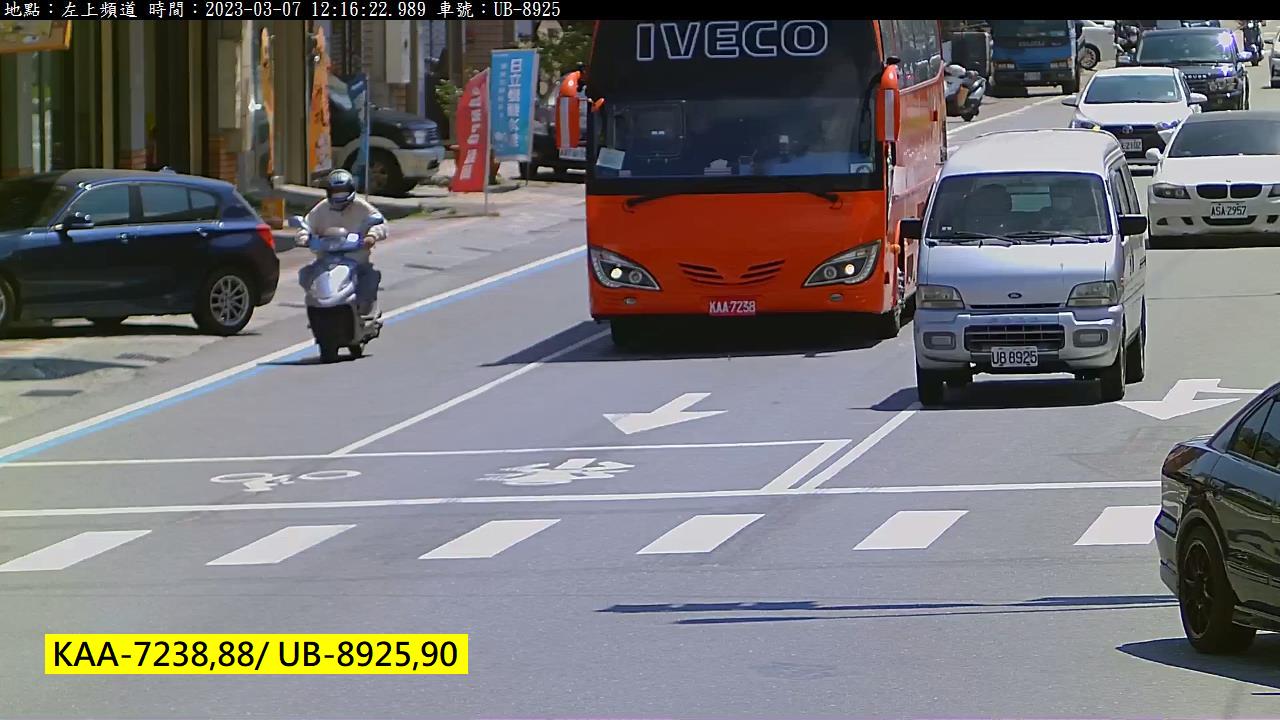 上面這個圖大家應該在國高中的物理課本上都看過,光線碰到鏡片會折射,攝影機就是利用這種原理,讓鏡頭前面,來自想看清楚目標的光線,盡量聚焦在鏡片後可以感光的底片或電子元件上!攝影時所說的「對焦」就是在做這件事!但是大家可能比較沒注意到的是:不同頻率的光線,折射率也不同!會聚焦的距離也跟著不同! 所以鏡頭前同樣距離的綠光與紅光,不會同時聚焦在鏡頭後面一樣的位置!所以如果調焦距時,你針對左邊的紅色車牌調整到很清楚,就是最佳化紅光的成像焦距,結果就是右邊的車牌(其他顏色)變得比較模糊了!但是紅色車牌出現的機率不到百分之一,我們為了最佳化整體辨識率,當然不會遷就辨識紅車牌讓其他車牌變得比較模糊,提高整體辨識率當然比較重要! 因為RGB三原色光在自然環境中,綠光的頻率在中間,光線的能量也比紅藍光更多更具代表性,所以調焦距時一定是以綠光聚焦最佳化為原則!這樣一來一般的白底黑字當然沒問題,連帶的綠底白字的工程車也受惠,被犧牲最大的就是紅色的車牌了! 這好像左右眼近視度數不一樣的人,被迫選擇一個雙眼必須同樣度數的眼鏡!如果你90%是靠右眼在看東西,當然會選擇最符合右眼度數的眼鏡,那左眼就會看得特別不清楚了!對我這個辨識軟體工作者來說,其實硬體焦距要如何調整運作?我也管不著的!多數攝影機都是自動對焦的,也一定會自動以綠光優先! 所以我只能接受現實盡力而為,如果為了極少數的紅色車牌做太多例外處理增強對比,不僅辨識時間會變長,還可能產生副作用讓其他車牌辨識率變差,所以必須很謹慎!就像公共政策應該照顧弱勢族群,但也必須衡量財務能量,以及弱勢族群與絕大多數一般人之間的權力及利益平衡!如果讓殘障弱勢者很方便了,卻讓其他所有人都變得很不方便,當然也是不行的! 我實際上怎麼作?其實一言難盡,反正努力了好多年,結果足堪告慰:現在我的辨識系統碰到紅牌的辨識率,雖然還是比其他車牌種類差,但已經不會常常整車漏掉了!像下面這種狀況,車牌算是相當模糊,也可以正確辨識了!