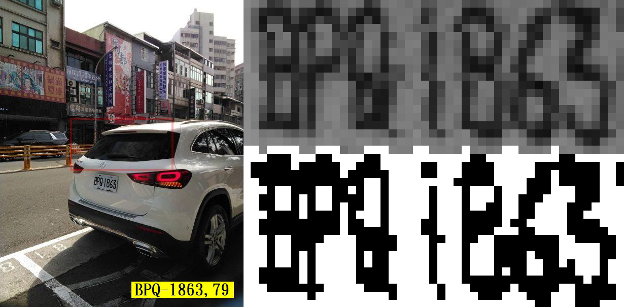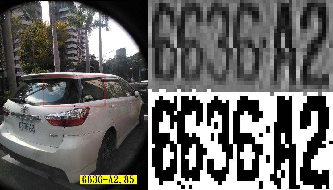 自然情境街景影像中的車牌辨識困難之處一言難盡,首先我們不會預先知道車牌的大小,所以必須各種大小的目標都要考慮,光是這一點就讓使用CNN方法的目標搜尋相當頭痛了!他們要找到目標還是必須先假設目標大概多大,才能據以設計特徵矩陣去全圖搜尋的!所以速度絕對慢得要死!即使有YOLO等技術突破還是非常慢的!慢到必須有GPU幫忙才能達到一般人可以忍受的程度! 但是使用OCR就好多了!不必預先假設目標多大?就一次掃描就可以全部圈出來了!前提是二值化必須做得好,讓字元能與背景盡量分開!如上約30萬畫素影像即使很難辨識的案例也多半只需0.2到0.3秒!當然不必用GPU的啦!一般規格的電腦就可以輕鬆搞定!也因此真正全程用CNN與DL的車牌辨識其實是非常罕見的!因為實在太慢了! 而且找到車牌目標只是辨識全程的三分之一!找到之後還必須作非常精準的幾何校正,否則稍微歪斜的車牌就無法辨識了!這也是DL與CNN很不擅長的事情!上圖右邊是已經用OCR技術做好幾何校正的車牌灰階與二值化影像,大家可以感受到如果車牌字元很小,就是在20畫素高度以下時的艱難狀況!你只能面對處理一堆馬賽克的資訊! 這種狀況當然字元之間的空隙會很不明顯,尤其是經過JPG壓縮的影像會更糟糕!但很奇妙的,人的眼睛就是可以看得很清楚,也代表我的車牌辨識軟體也必須能夠正確辨識,否則就不好意思說自己是甚麼AI影像辨識了!此時很多統計學的概念就會被我使用了! 譬如即使字元無法粒粒分明,但是字元間隔處的灰階數值還是會較高(較亮),每個字元的概略寬度(除了1與I)及高度也應該是一樣的…等等等等!我的數學就是盡量用這些統計參數正確切割出字元的小影像,做最後的字元對比的!所以機器學習賴以為生的機率統計技術我也有用的!但是是在確定資訊都用完,進入到這麼模糊的區間時才會在有限範圍內使用的!我必須估計字元的寬高嘛! 最近拿到的一批停車柱拍的影像多數就是解析度較低的!也正好可以用來調整優化我這些底層的機率統計演算法的細節!上一批52張一開始是只能辨識正確一半,經過幾天調整就逼近90趴了!剛剛又取得五百多張類似影像,很興奮有得玩了!我的車牌辨識也會更進化了!