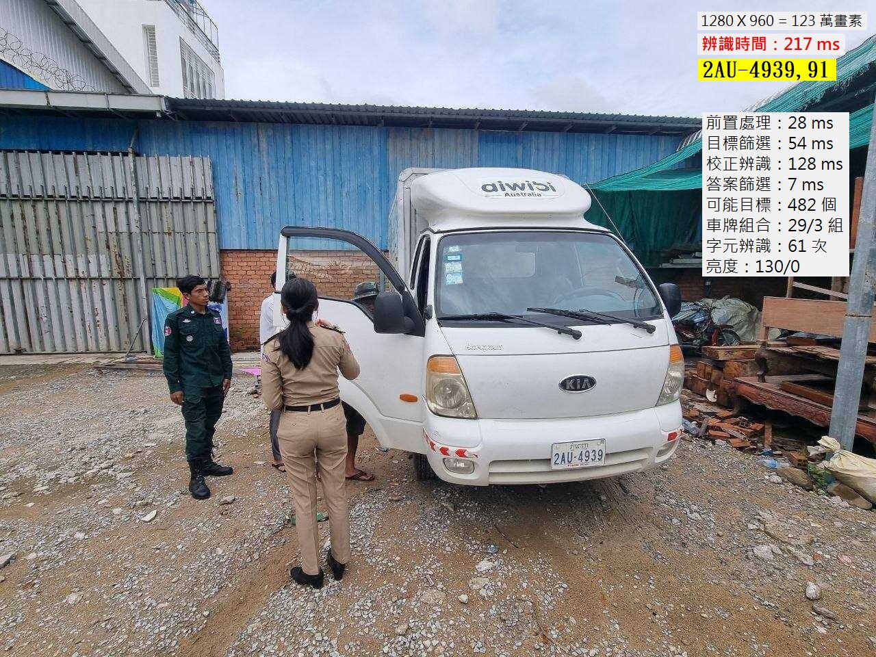 看上面的可能目標的輪廓圖就知道為何如此了!就是地面太花了,不一一處理就很難確定是不是有遺漏模糊的車牌!每組雜訊都要正經八百地做完全程的車牌辨識呢?結果就是非常耗時了!怎麼辦呢?關鍵技巧還是如前文所述!就是必須在車牌處理的程序前段就盡早判斷排除不可能是車牌的組合! 有點像淘汰率很高的特種部隊訓練,不可能通過最終考驗的學員,就早點退訓節省資源吧?如果將必須通過的難關(或檢驗)放在訓練前期,迅速淘汰必然會失敗的人,資源使用就很省!反之,魔王關卡或考驗都放在訓練後期呢?受訓與訓練的人都會浪費太多最終等於無效的時間! 所以早上碰到這堵牆壁,就更仔細的研究分析每組可能車牌目標組合的特徵屬性,主要是看幾個同組目標的排列曲折度!硬湊出來的排列組合就會很曲折,正確的車牌則都是很平整的直線!這樣很快地就讓地面大部分的可疑目標組合被淘汰了!結果就是如下圖的217毫秒了!想考倒我?題目必須更難一點!