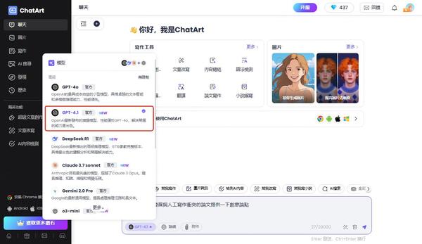 搭載多款最新、領先的語言模型,如,擅長邏輯推理、語意理解與多語言對話。無論你需要編寫 Email、優化文案、學習新知識或進行語言翻譯,ChatGPT 都能即時給出專業、有邏輯的回答。 對於需要高品質文字處理的用戶,ChatGPT 是非常值得信賴的選擇。 ChatArt- 多合一AI工具,從聊天到創作一手包辦