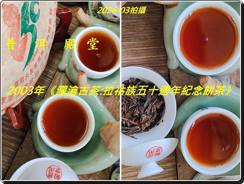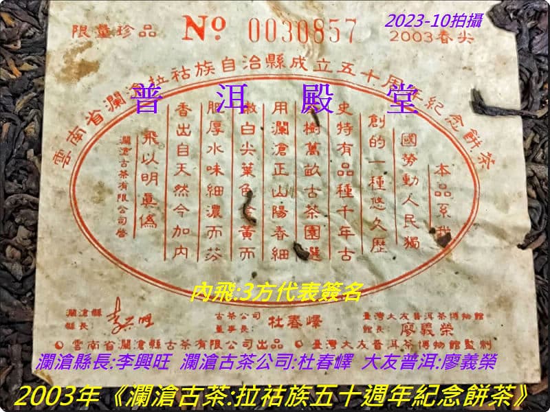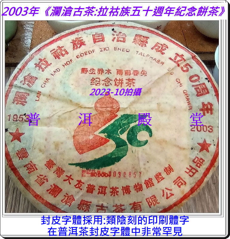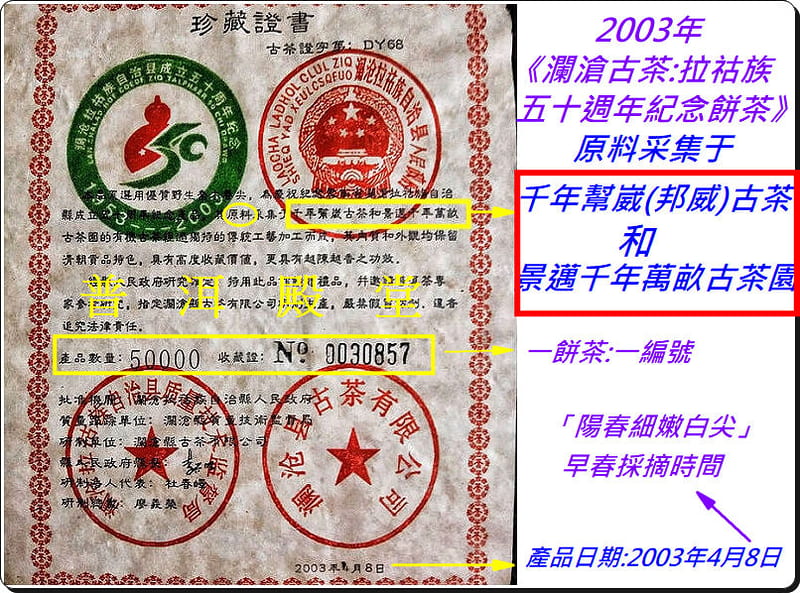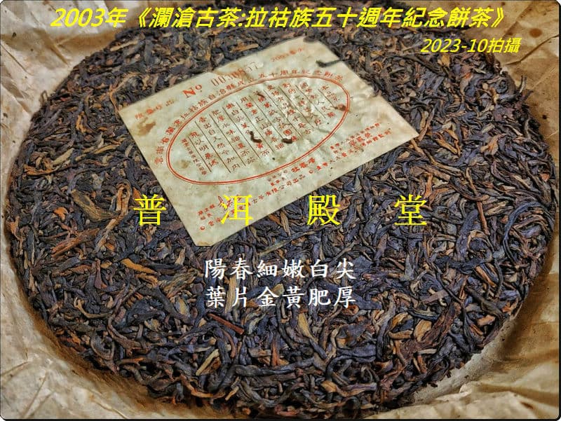 【品名之簡稱】拉祜族五十週年餅茶 【生產年份】2003年四月 【生/熟茶】生茶 【用料】邦威千年古茶與景邁千年古茶之「野生喬木雨前春尖」 ※特註:本品乃大友自製普洱第一頂級、空前絕後的最極品茶料!
