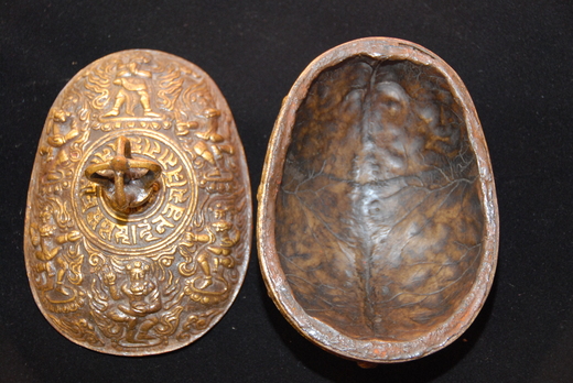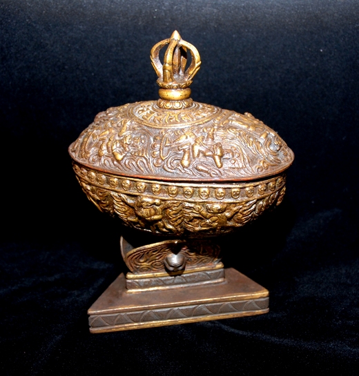 顯密法器文物介紹 分類:喇嘛舍利(人骨嘎巴拉供器) 上 蓮花釋樂智 嘎巴拉碗(顱器)乃是用喇嘛的顱骨(頭蓋骨)上半部所製成的,而嘎巴拉供器,是密宗修無上瑜珈生起次第時,所需用到的法器。嘎巴拉所做成的骷髏碗,又稱做內供顱器、是「修無上瑜伽密部」上師為行者舉行灌頂儀式時所用的法器,為藏傳佛教常用的法器之一。灌頂的意義是使行者能入佛智,斷我執,並由上師將本尊佛的種子植入行者的阿賴耶。而密宗行者在舉行灌頂儀式時,上師會在顱器內盛葡萄酒或聖水,將聖水灑在行者的頂上,並讓其將甘露喝下,然後才授予密法。 無上瑜珈是屬金剛密乘四部續中最高層次階段,此階段區分為『生起次第、和圓滿次第兩個階段。』修生起次第時,行者要先觀想本尊佛像以及曼陀羅壇城,如行者能觀想壇城是越細密越好。這有什麼作用呢?在此娑婆世界的眾生,因一時被無明所遮蔽,所見所及全部都是不清淨的現象。而行者在通過了密法的修練後,才使我們領悟到這一切都不是真實的存在,是幻覺,是本來就清淨,是無生亦無住,是本來就寂靜的。在菩薩的眼中外器世間(即天地、日月、山河大地)本是很清淨。彌勒五論中的《莊嚴論》裡講過,菩薩到了八地時,開始轉識成智,當其根識(眼、耳、鼻、舌、身、意、根等識。)轉化成智慧以後,在菩薩的眼裡所見一切,就如同是極樂世界一樣!地面上不再是山川、土石瓦礫,而是金銀琉璃珍寶等等,【註:這是針對一般的行者所指。】 在行者心中所謂的「金銀、琉璃、珍寶。」此諸概念也是不清淨的!但因為人們喜歡金銀、琉璃、珍寶等世間物,所以才將這清淨刹土形容成如金銀、琉璃、等珍寶的樣子,這是針對眾生的喜好而言的。然實際上,在佛菩薩的境界之中,這一切都只是夢幻泡影的現象,所有一切情器世間是非常清淨的,沒有染著!所聞的是妙法音聲,所飲的是甘露法味。凡是用言詞所能傳遞的,都只是屬於分別概念的階段,這些都無法真實地表達,菩薩摩訶般若的境界。 嘎巴拉內供是密教行者用於觀修《五大金剛、時輪、上樂、密集、大威德、喜金剛、大幻化網、轉輪王、金剛瑜珈母。》等一切無上金剛瑜珈密續所需用到的法器!而此法器嘎巴拉碗,最好本身就是一位修無上密的瑜珈行者,此為最上供器。(此等法器,可遇不可求)!內供觀修,行者觀白色的大嘎巴拉碗,在碗的中央有一大裂縫,碗的內部呈紅色,整個嘎巴拉碗,放在一個由紅、白、藍三顆人頭所搭成的三角架上。三角架立在一個倒置的三角形火壇城,和一個正放的藍色碗狀風壇城中間。風壇城中的旋渦使火壇城向上燃燒,逐漸熔化大嘎巴拉碗內的供品!風壇城的兩側是兩個白色或金色的甘露寶瓶,每隻瓶中各伸出一根紅色檀香木杆,杆上系有一個迎風飄揚的三角形勝利幢,瓶頂還裝飾著一牦牛尾的三角幡。碗內的供品有五甘露和五肉(此為祕密供物!) 行者觀黃色甘露大香在東方(前) 、綠色甘露骨髓液在北方(右) 、白色甘露明點在西方(後)、紅色甘露菩提在南方(左)、藍色甘露小香在中央。五肉排列為黑色牛在東南方(左前方) 、紅色或藍色狗在西南方(左後方)、白色象在西北方(右後方)、綠色馬在東北方(右前方)、紅色人體在中央。【註:其它口訣觀修須經根本上師法王蓮生佛親自教授!】 以上為略述。行者在禪修生起次第時,這風壇城、火壇城、嘎巴拉碗內的供品,分別代表著地、水、火、風四大要素!碗下三顆人頭,白色象徵行者的身、紅色象徵行者的語、藍色象徵行者的意。嘎巴拉碗本身亦象徵大樂,其白色的外殼代表為父之(白菩提) 、紅色內殼代表為母之(紅菩提) ,碗中央十字縫隙象徵著方便與智慧、色與空、及真空妙有、慈悲和究竟。 五甘露象徵五佛、五識、五蘊。大香表大日如來,象徵視覺和色蘊、骨髓表不空成就如來,象徵觸覺和行蘊、父之(白菩提) 表無量壽如來,象徵味覺和想蘊、母之(紅菩提) 表寶生如來,象徵嗅覺和受蘊、小香表不動如來,象徵聽覺和識蘊。行者經由五甘露、五肉、五蘊、五方、五大要素轉化為明光,內觀提明點,轉為大樂空性看光瑜珈,經四喜化為四空,四無量。行者唯有發菩提心,並累積無數的資糧,才能真實的覺受到這一切,而證達到無我空性,了解到現前萬法,本來就清淨的。行者以密宗特有的修行方式,依真佛大圓滿法,即使是世俗凡夫,也能現見本來清淨的境界,為什麼在密教能辦到,而顯法卻不能辦到呢?在《維摩詰所說經》裡有這麼一段內容,釋迦牟尼佛有一次,在傳法時說道:諸位菩薩如果想感受外境的清淨,就應當自淨其心,心淨,則外境清淨,修行至心淨之時,外境也會隨之而清淨。當時,舍利子也在佛陀身邊,他心想:娑婆世界這麼不清淨,難道釋迦牟尼佛的心仍然沒有清淨嗎? 佛陀得知他的想法後,便反問舍利子,生盲看不到日月,這是日月的過失,還是盲人的過失呢?舍利子回答說,是盲人之過,而非日月之咎。因為盲人沒有眼睛,所以看不到日月,而不是日月不存在。佛陀又說道,娑婆世界的本體永遠是清淨的,但凡夫就像盲人一樣,始終無法得見!此時,一位從其他佛刹來至娑婆世界聽法的菩薩說道,我現在所見到的這個佛土就是清淨的。舍利子不以為然,就反駁道,此佛土是不清淨的!於是他們二人就展開了激烈的辯論。正當難解難分之際,佛以神通顯示了娑婆世界的本來面目,這在場的所有人都親眼目睹到,娑婆世界就像西方極